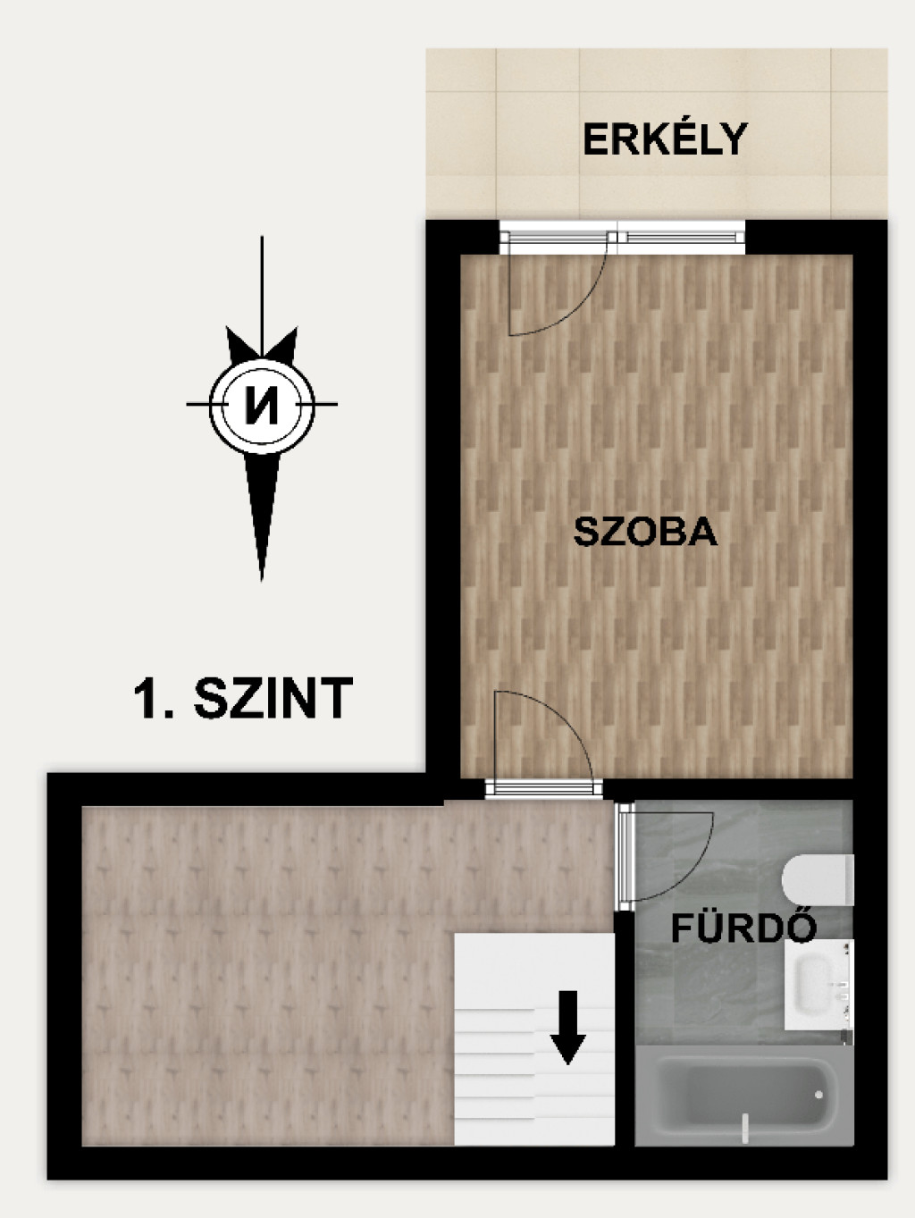 Az 1. szinten szinte egy külön apartman található, hálószobával, fürdővel és belső udvarra néző erkéllyel.