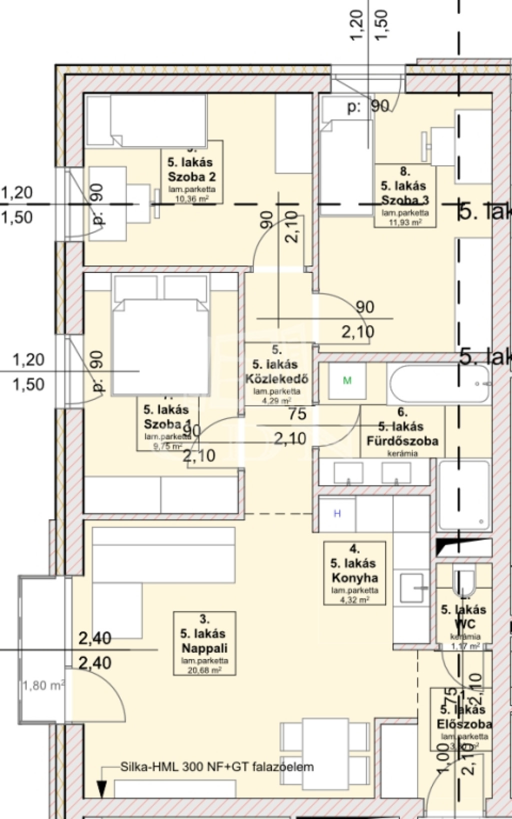 A B5 megjelölésű első emeleti lakás 72,8 m2 területű. Az amerikai konyhás nappalin túl 3 szoba, fürdőszoba, mellékhelyiség, közlekedő és előszoba kapott teret a lakásban. A közösségi térből közelíthető meg a 2 m2-es erkély.