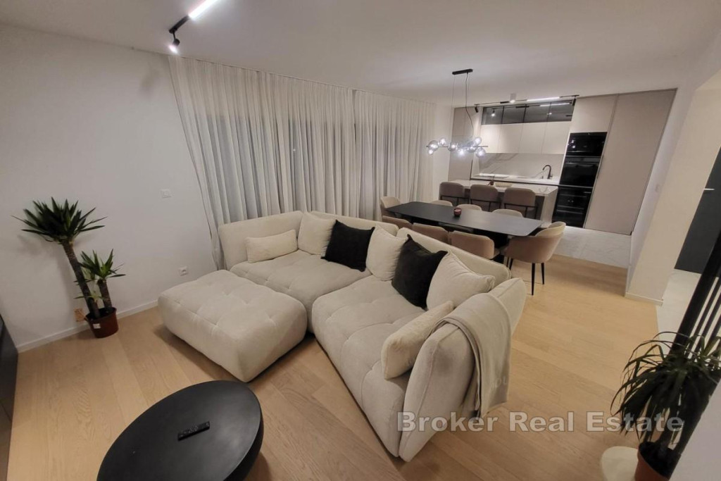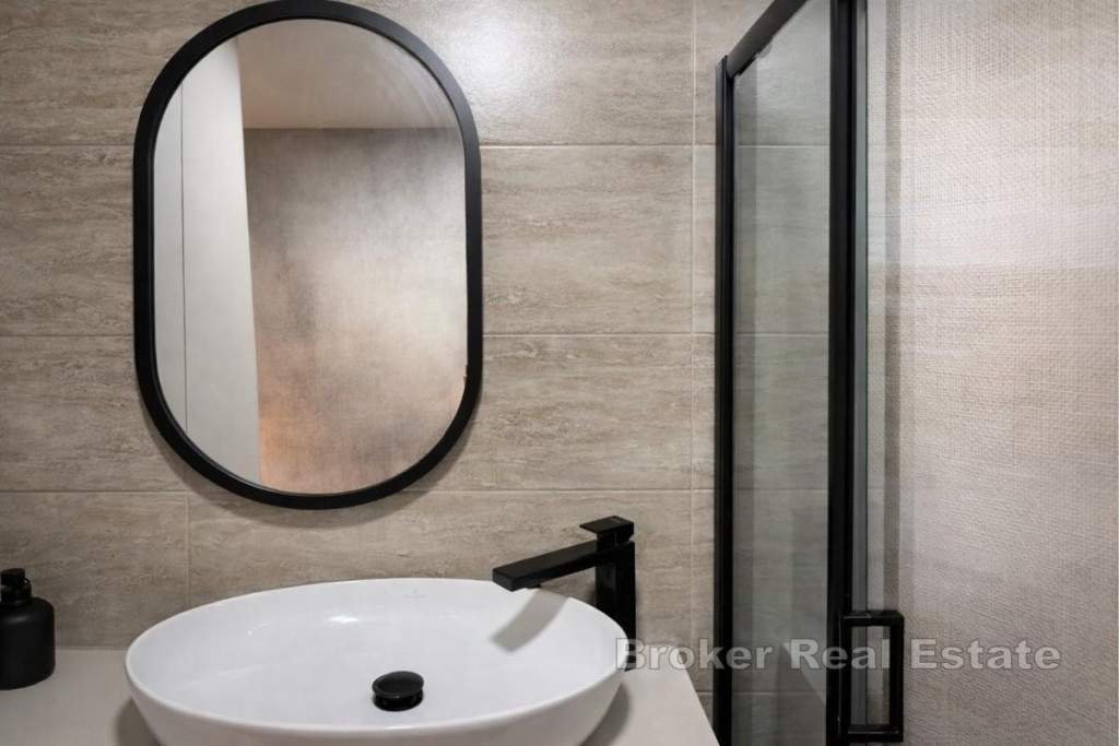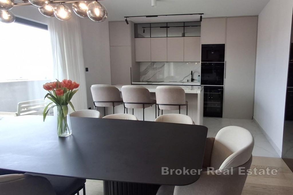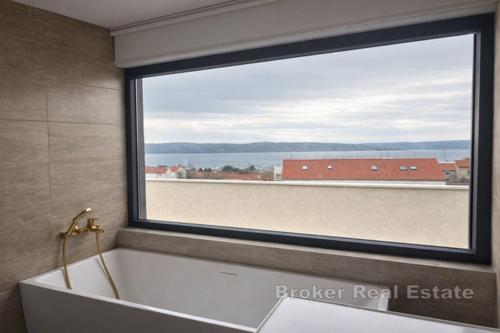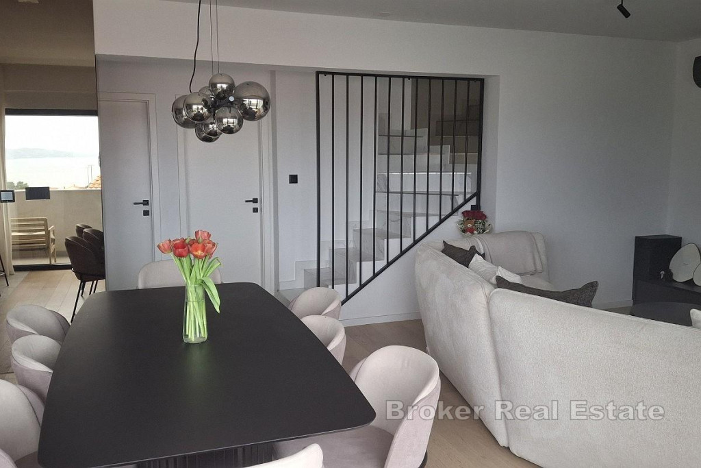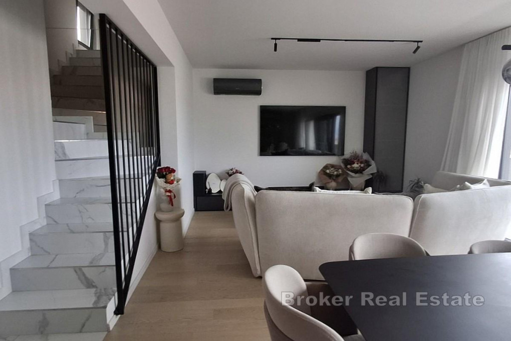 For sale is an extremely attractive, spacious and functionally designed two-story penthouse with a total area of 82.28 m², located on the second floor and superstructure of a quality residential building, in an excellent and sought-after location with an open sea view. The apartment is characterized by a thoughtful layout, plenty of natural light and a sense of privacy, and consists of two floors. On the second floor there is a modern kitchen connected to the dining room and spacious living room, a bathroom, a hallway and a comfortable bedroom, while on the superstructure there is an additional room, a bathroom, a wardrobe and an internal staircase, which gives the space a dynamism and luxurious feel. The special value of the property is made up of generous outdoor spaces: a southern loggia with an area of 10.68 m², ideal for enjoying the sun and the view, a western loggia with an area of 4.67 m², perfect for relaxing in the afternoon. A large uncovered terrace on the superstructure with an area of 62.82 m², ideal for socializing, sunbathing and creating a private oasis, an additional uncovered terrace on the northern part of the first floor with an area of 58.58 m², accessible from the common part of the building The apartment also includes two practical storage rooms in the basement (6.28 m² and 4.30 m²), which additionally contributes to the functionality and comfort of everyday life. The entrance to the apartment is on the west side from the common part of the building, ensuring discretion and peace. The property is located in an extremely desirable location, in the immediate vicinity of a school and kindergarten (approx. 500 m), cafes, restaurants and all facilities necessary for a pleasant life, and the sea is also only a few minutes’ walk away. Thanks to the open sea view, large terraces, excellent location and functional layout, this property represents an ideal opportunity both for a pleasant year-round life and for an extremely profitable tourist rental. BROKER REFERENCE ID:2031/228