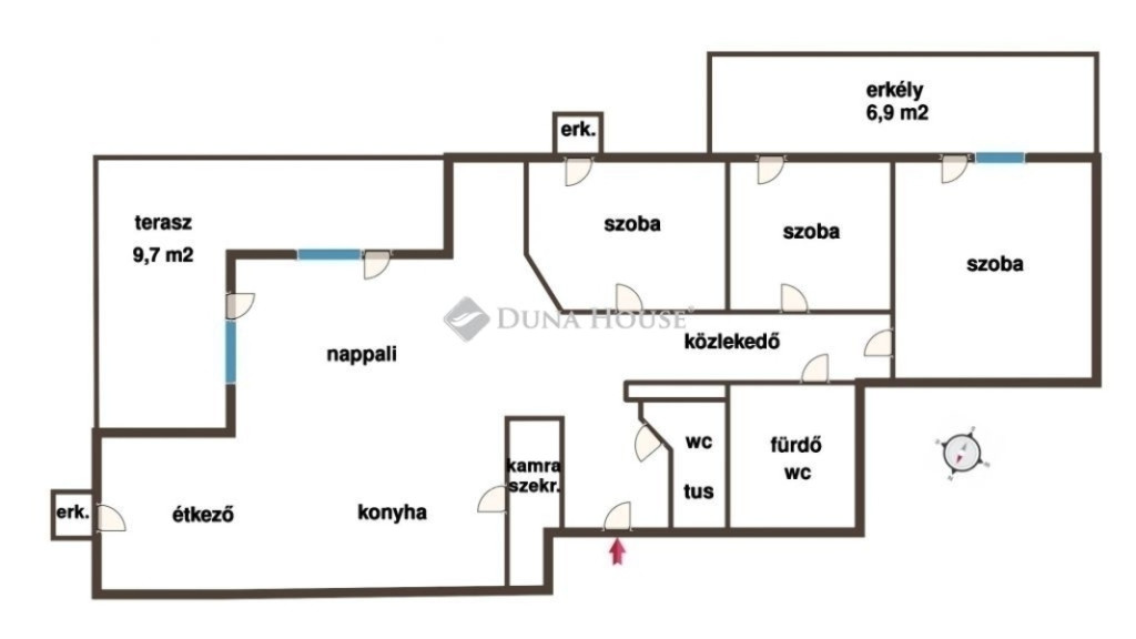 Az ingatlan különleges vonzerejét a 6,9 m2-es erkély és a 9,7 m2-es terasz adja, ahonnan csodálatos kilátás nyílik a gyönyörű zöld övezetre.