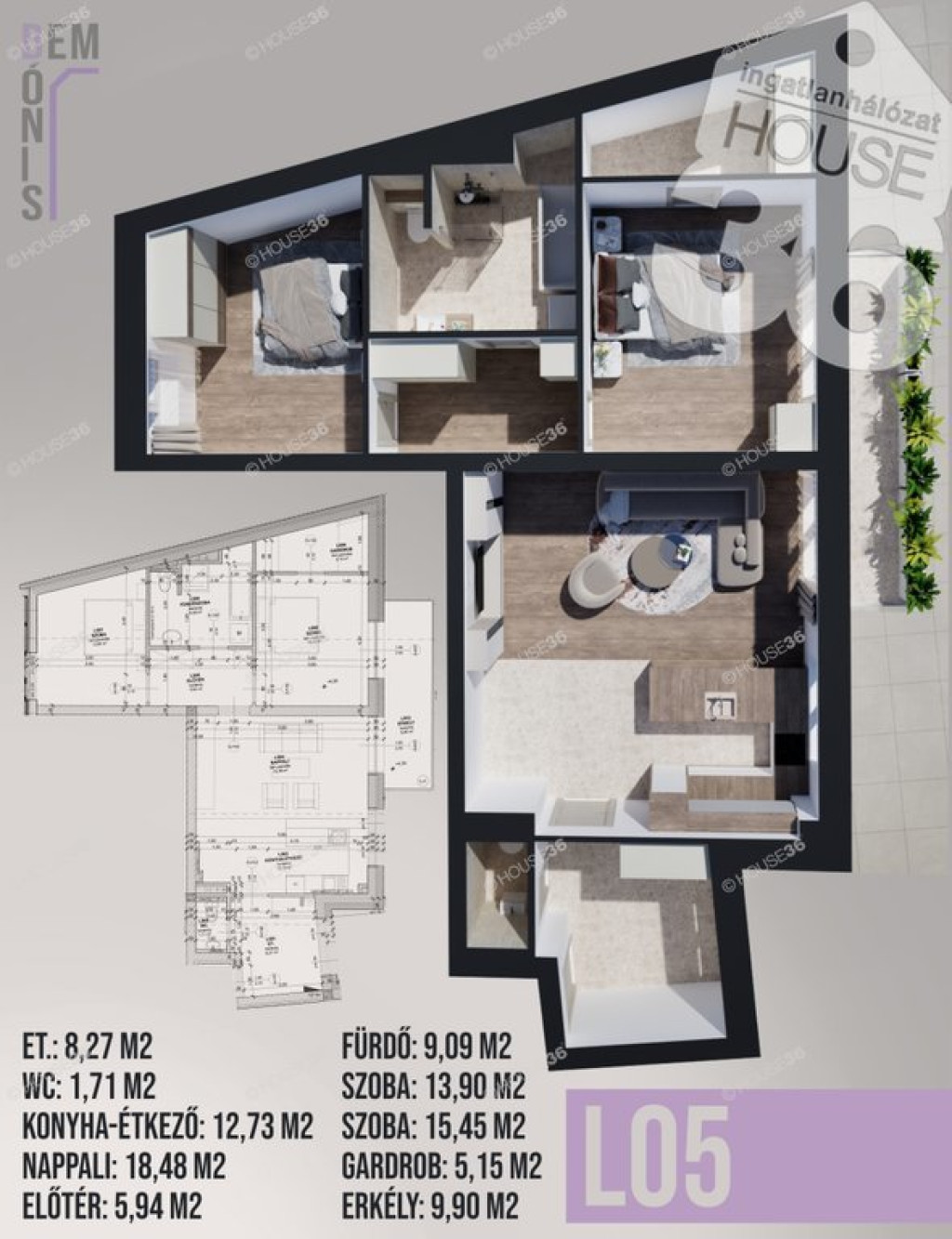 A 90 m²-es lakótér és a hozzá tartozó 9,9 m2 erkély a belvárosi "boutique" életérzést hozza el: tágas szobák, külön gardrób és egy minden igényt kielégítő fürdőszoba várja az új tulajdonost.