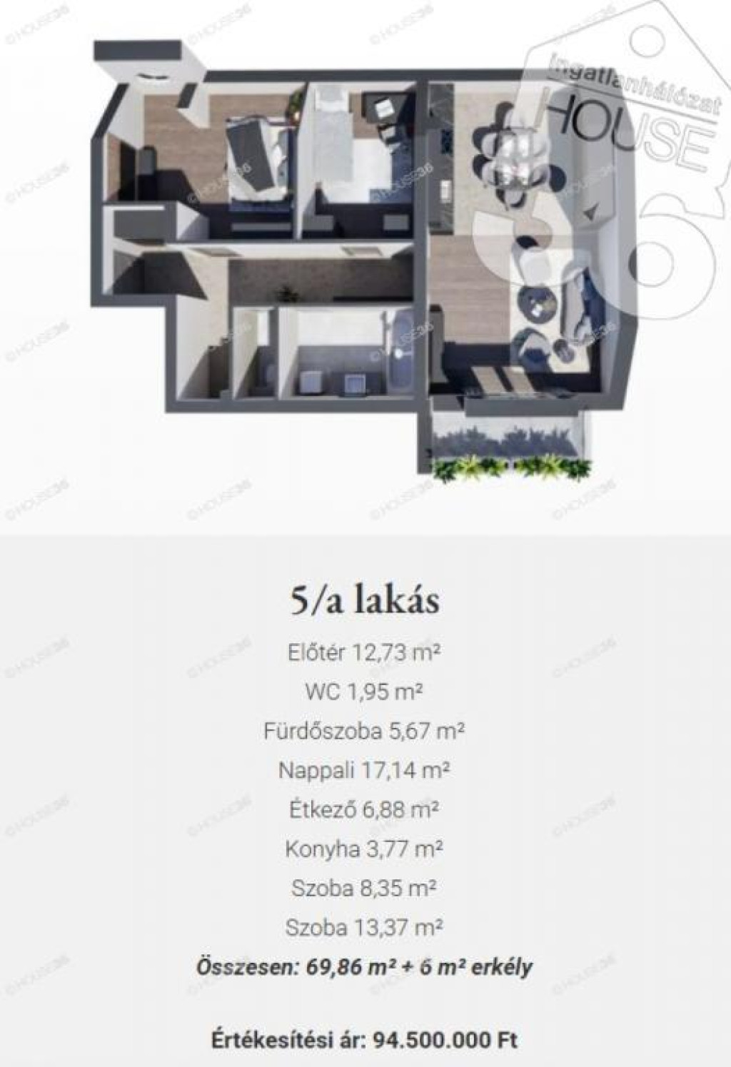 5/a lakás, 69,86 m2, nappali + 2 szoba, 6 m2 erkély