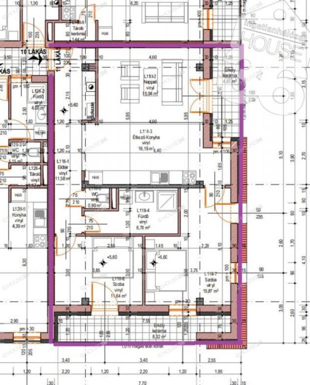 Szobákban laminált parketta, egyéb helyiségekben vinyl illetve hidegburkolat.