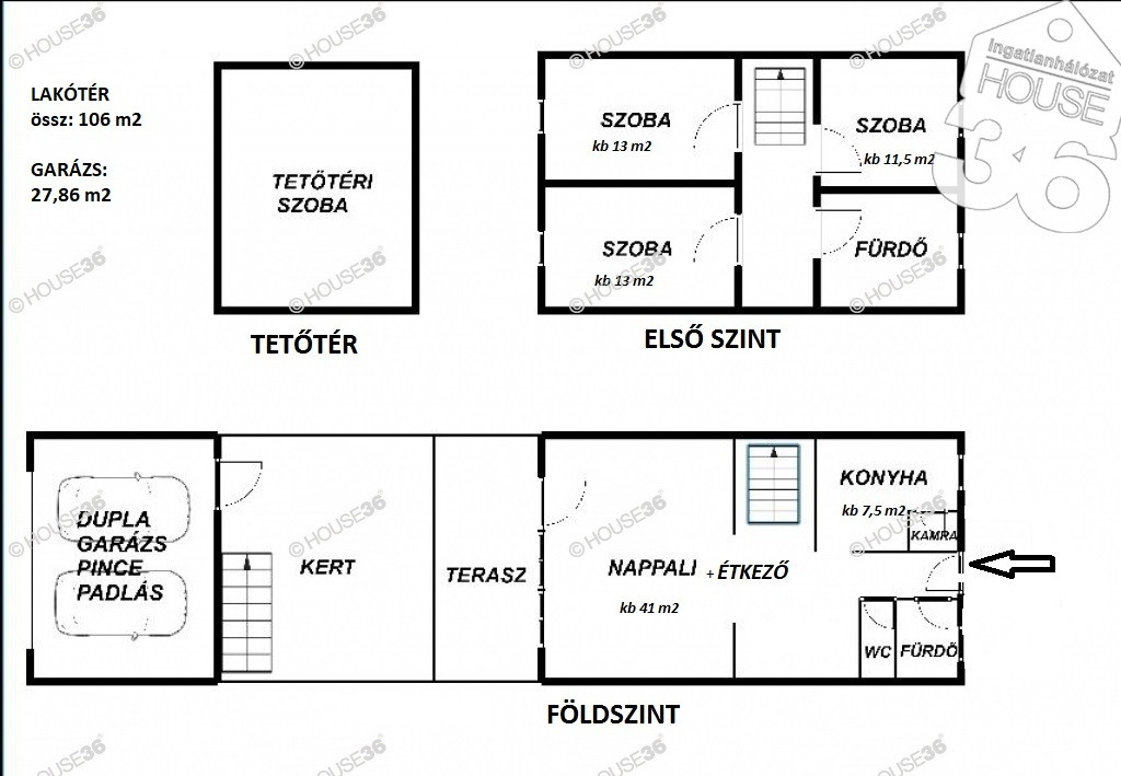 Földszinten: nappali+konyha+kamra+étkező+zuhanyzós fürdő és külön WC