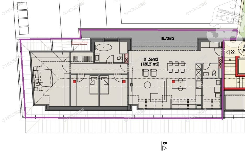Az épület III. emeletén, bruttó 130,21 m2, nettó 101,56 m2 lakóterű, nappali + 3 szobás lakás, 18,73 m2 erkéllyel megvásárolható.