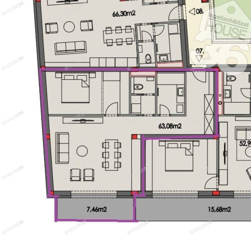 Az épület első emeletén, 63,08 m2 lakóterű, nappali + 1 szobás lakás, 7,46 m2 erkéllyel megvásárolható.