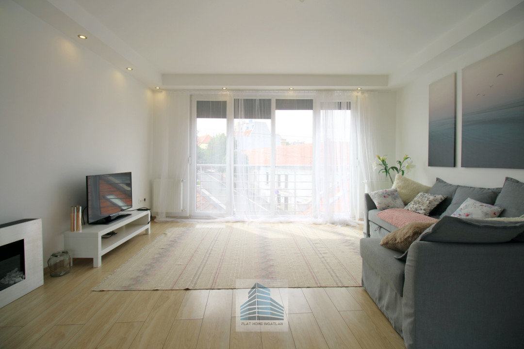 Elosztása szerint: 2 hálószoba, fürdőszoba, Wc, tetőterasz, amerikai konyhás nappali (nagy méretű, panorámás nyílászárókkal az épület két oldalára nyitott lakótér és dinamikus életérzést nyújt szinte egész napon át.)