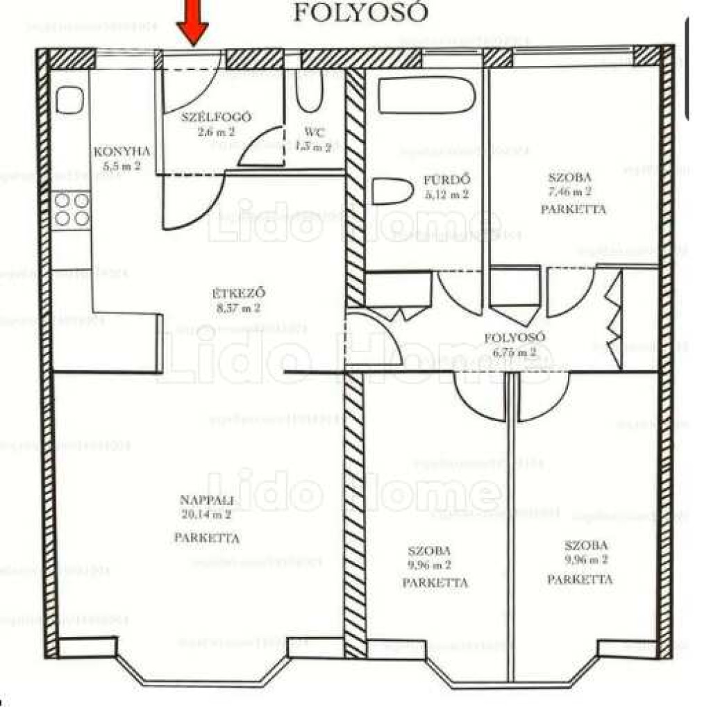 Lakás helyiségei: szélfogó, nappali, három szoba, konyha, étkező, közlekedő, fürdőszoba, külön WC.
