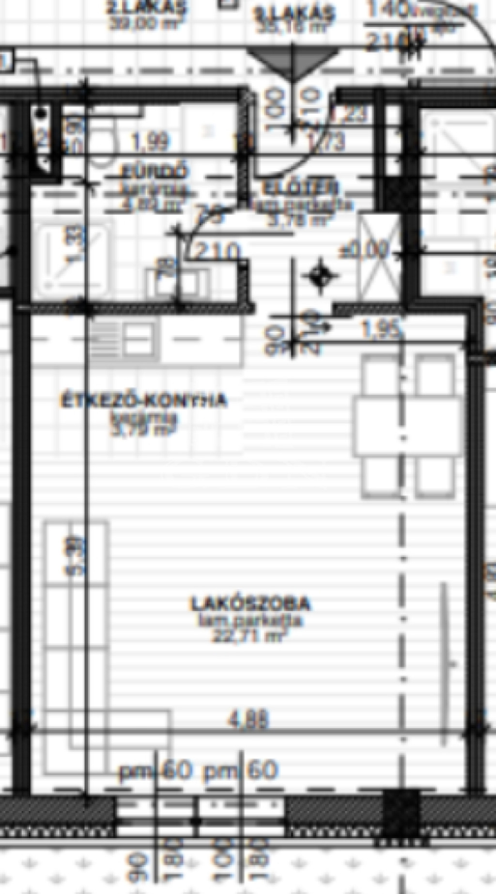 A lakás 35,16 nm, helyiségei:előtér 3,78 nm, fürdőszoba 4,89 nm, étkező/konyha 10,17 nm, nappali/lakószoba 16,32 nm.