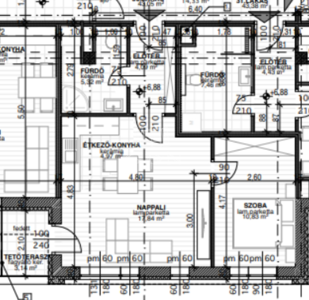 A lakás nettó 43,05 nm, helyiségei:előtér 4,09 nm, fürdőszoba 5,32 nm, étkező/konyha 6,19 nm, nappali/lakószoba 16,62 nm, szoba 10,53 nm, terasz 3,14 nm.