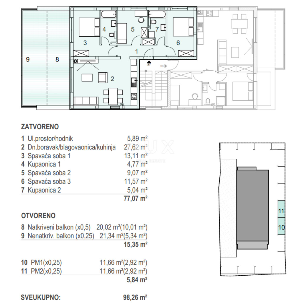 Az S8 apartman a második emeleten található, két hálószobából, egy padlófűtéses fürdőszobából, egy tágas nappaliból konyhával és étkezővel, valamint egy fedett, tengerre néző teraszból áll, amely ideális a meleg nyári estéken való pihenésre. Az apartmanhoz két parkolóhely is tartozik.