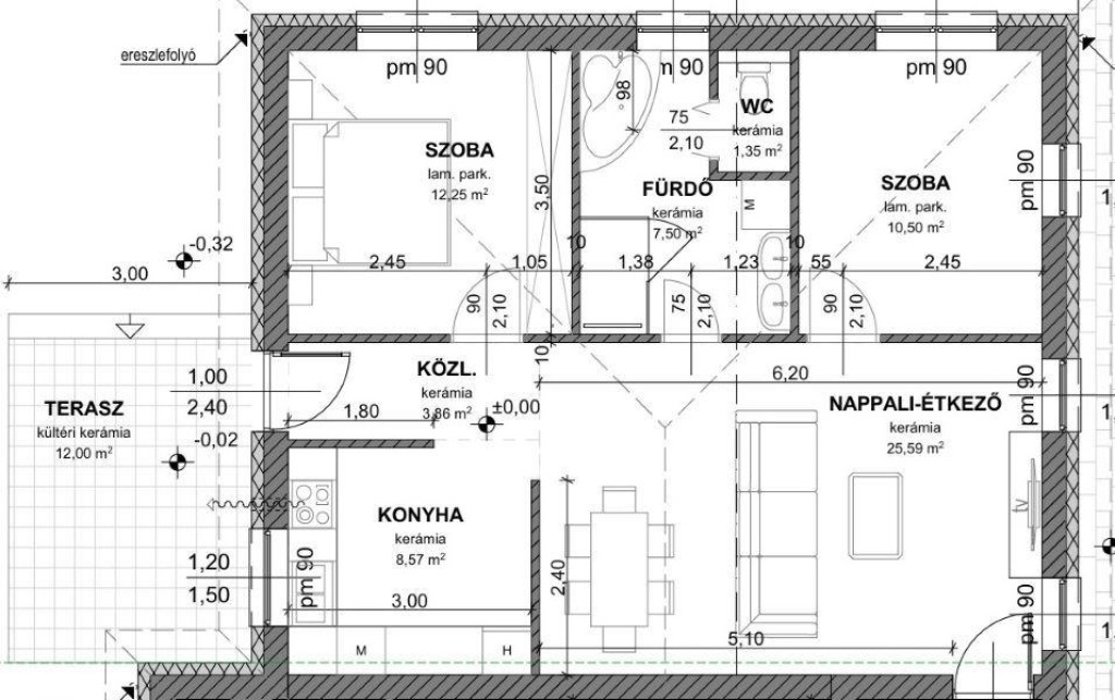Elrendezés: Az alaprajz rendkívül funkcionális: a központban a világos, D-DNY fekvésű nappali-étkező áll, melyhez egy jól felszerelt, különálló konyha csatlakozik. A két hálószoba (10,5 m² és 12,25 m²) ideális életteret biztosít.