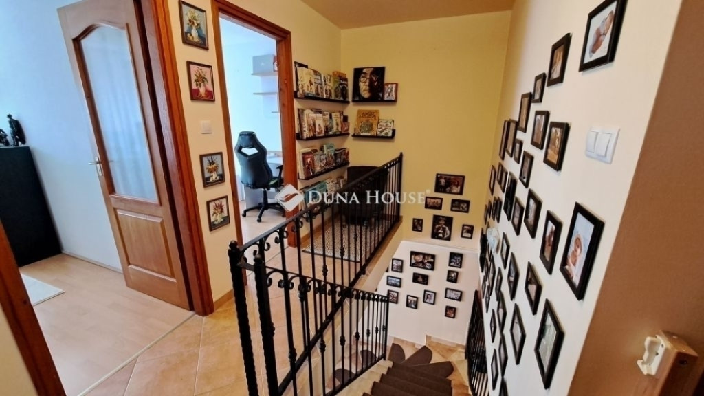 Az emeletre igényes kivitelezésű, kovácsoltvas korláttal ellátott lépcső vezet fel. Mindhárom hálószoba jól használható méretű.