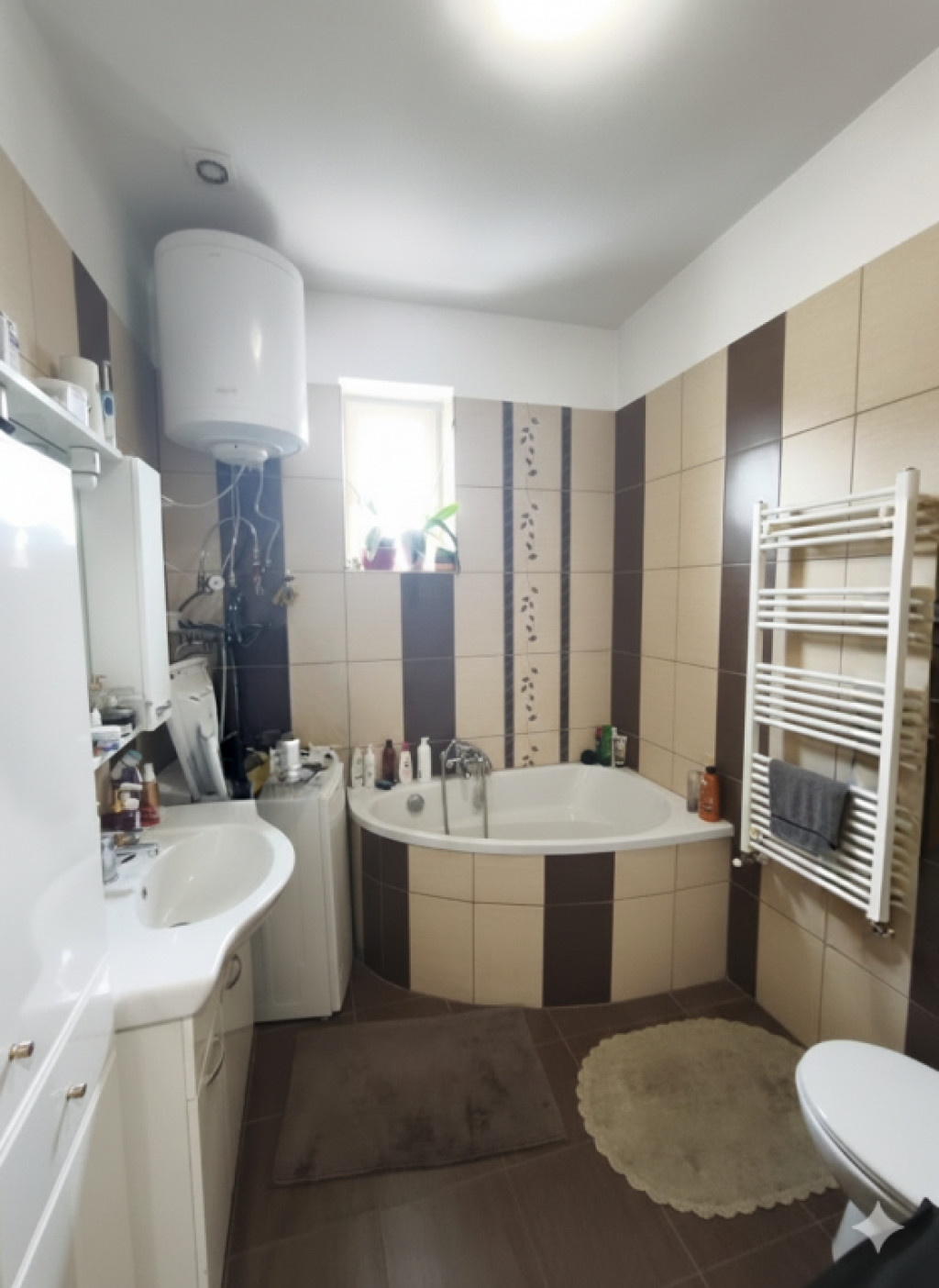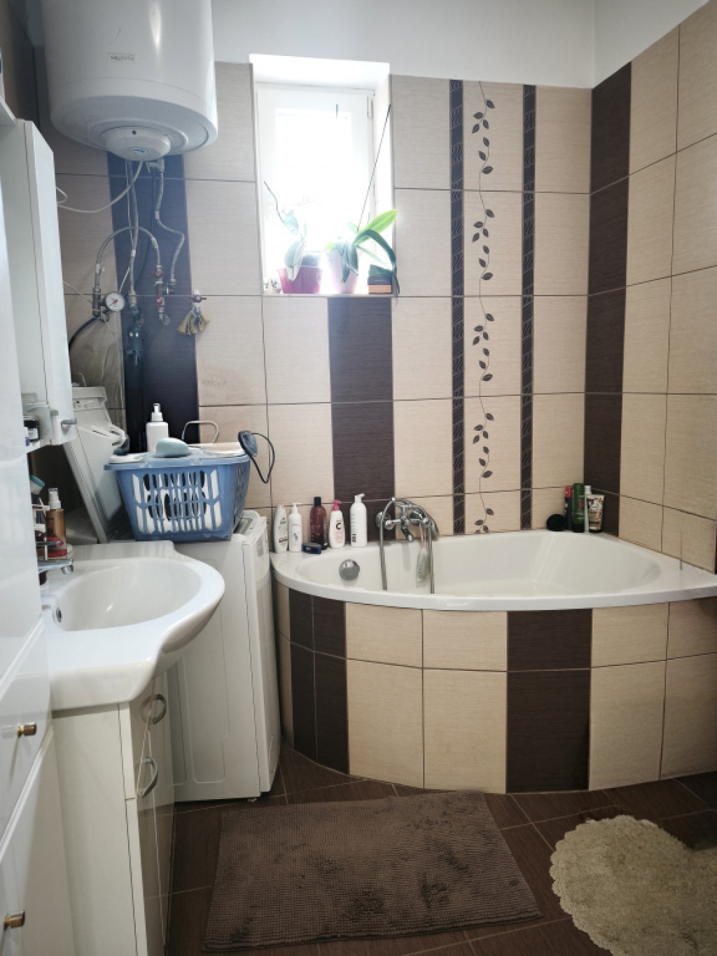 -Tágas fürdőszoba sarokkáddal, WC-vel, mosdóval, mosógépkiállással