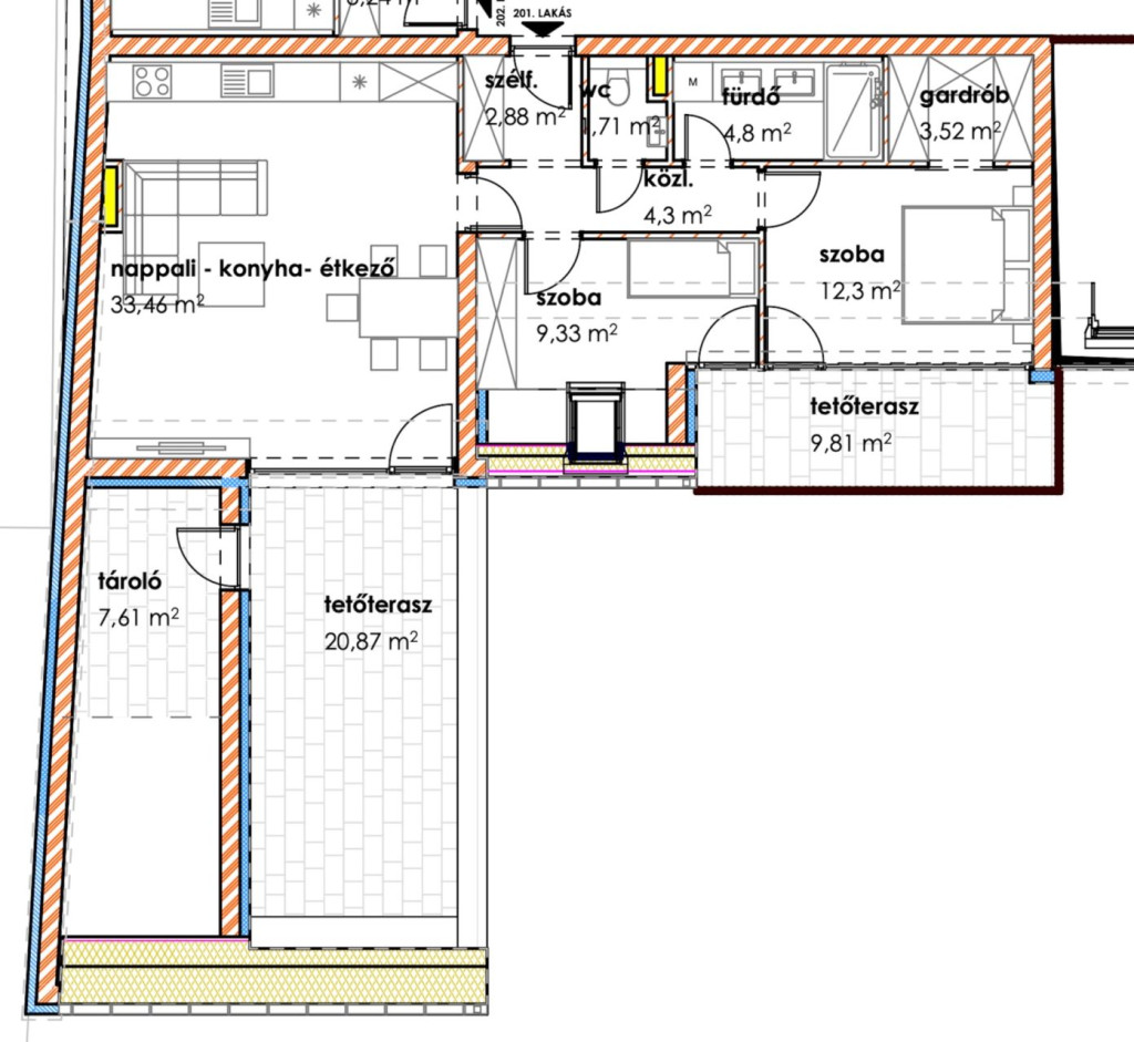 A 1 db amerikai konyhás nappalival, 2 db hálószobával, 1 db fürdőszobával, közlekedőkkel, gardróbbal, loggiával és terasszal rendelkezik.
