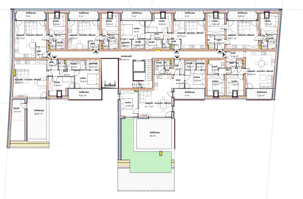 Makón, presztizs lokációval rendelkező - Makói fürdőtől 30 méterre - a Szent János téren - A Napfény Residenceben - , Eladó egy most induló, tégla építésű, MÁSODIK EMELETI , 110 nm-es élettérrel rendelkező, amerikai konyha nappali plusz kettő szobás loggiás, és teraszos exclusive tégla lakás (2.em 1.lakás), melyhez saját tároló is jár.