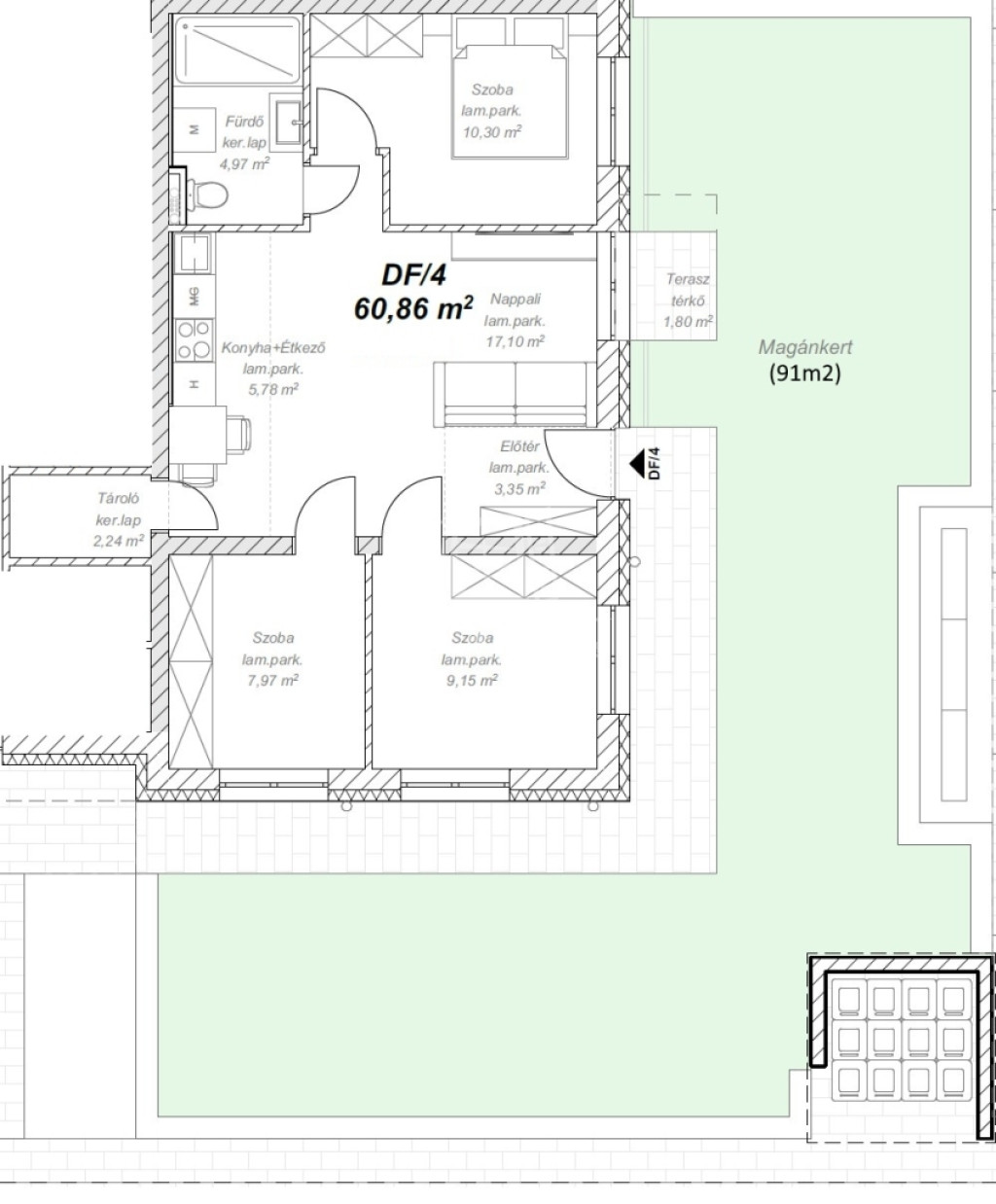 Fontos kiemelni, hogy a lakás egyik különleges előnye, hogy a bejárat nem a hagyományos lépcsőházból, hanem a lakás saját, belső kertrészén keresztül közelíthető meg. Ez az egyedi kialakítás nemcsak esztétikai értéket képvisel, hanem jelentősen növeli a privát komfortérzetét is — a közvetlen kertkapcsolat révén nyugodtabb, intimebb lakókörnyezetet biztosít, mint a szokványos társasházi megoldások.