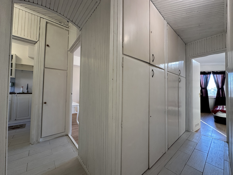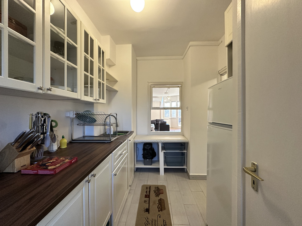 A lakás 2,6 m belmagasságú, napfényes és otthonos, minden részlete átgondolt. Az újrafestett lambériázott közlekedő folyosón mennyezetig érő beépített szekrények biztosítják a tárolás kényelmét.
