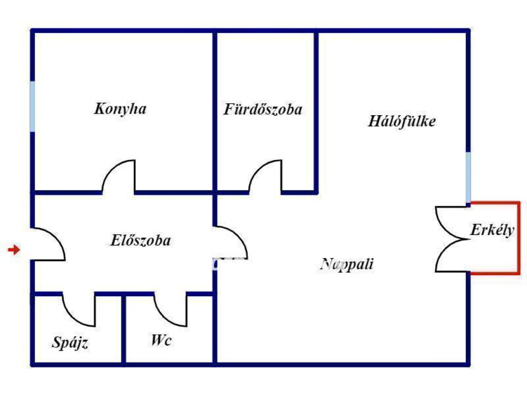 Jelenlegi Elrendezés: Világos szoba hálófülkével, konyha, fürdőszoba, külön WC és spájz.