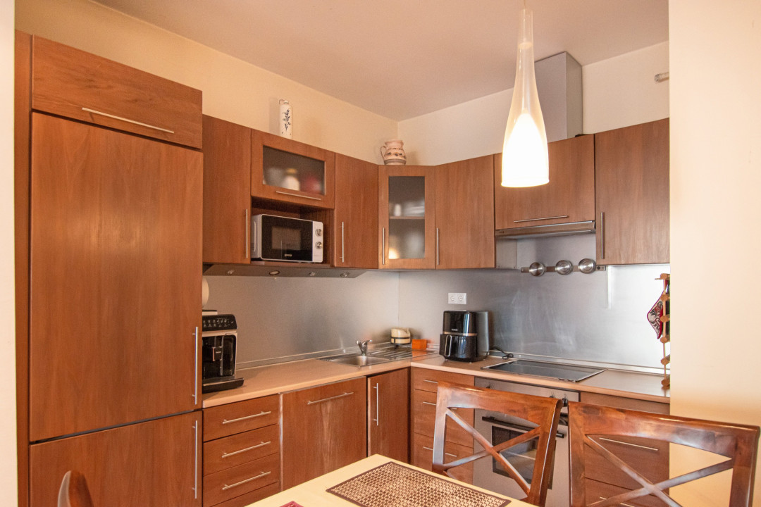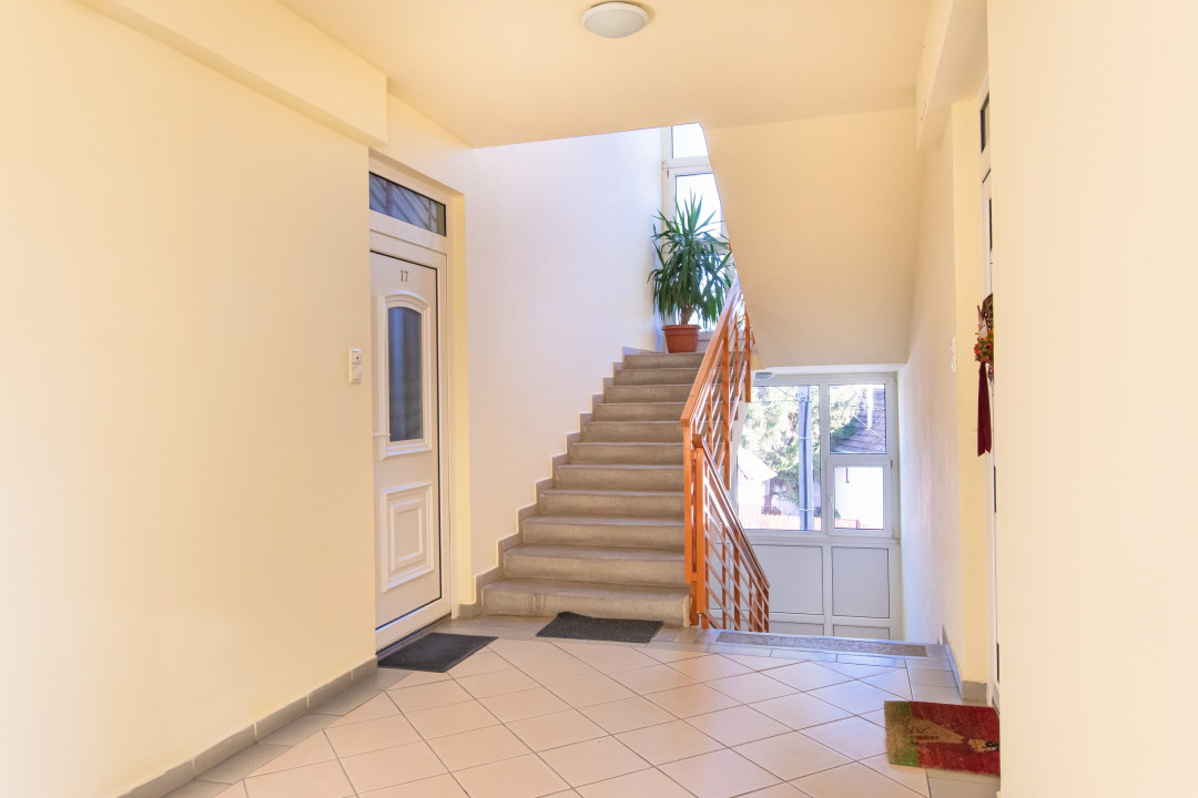 A hálószobából nyíló 5 m²-es terasz délután napfényben fürdik – tökéletes hely egy kávé, pihenés vagy beszélgetés mellé. A nappali és a konyha egy légtérben található, ami a mai modern igényeket is kielégíti, az előszoba beépített gardróbszekrénye pedig praktikus tárolást kínál.