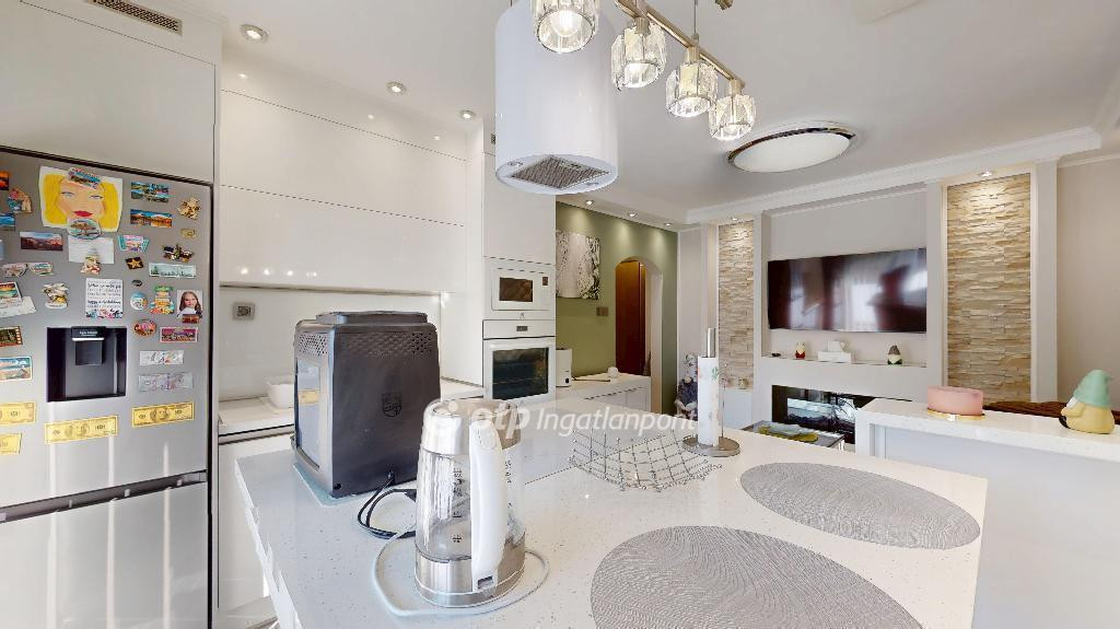 A konyha konyhaszigettel, Electrolux indukciós főzőlappal, beépített sütővel, mikróval, hűtővel és páraelszívóval van felszerelve, valamint AEG mosógép is tartozik hozzá. A teljes bútorzat és háztartási gépek a vételár részét képezik, így az ingatlan azonnal költözhető.