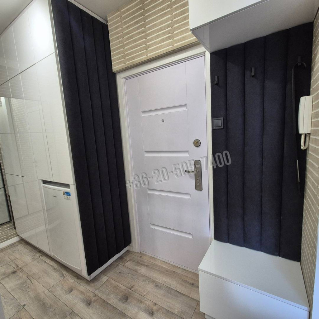 A lakás kialakítása átgondolt és harmonikus, a belsőépítészeti megoldások nemcsak látványosak, hanem praktikusak is. Az egyedileg tervezett konyha, az előszobabútor és a nagyméretű beépített gardrób egységes stílust képvisel, amelyet a kárpitozott előszobafalak tesznek igazán különlegessé.
