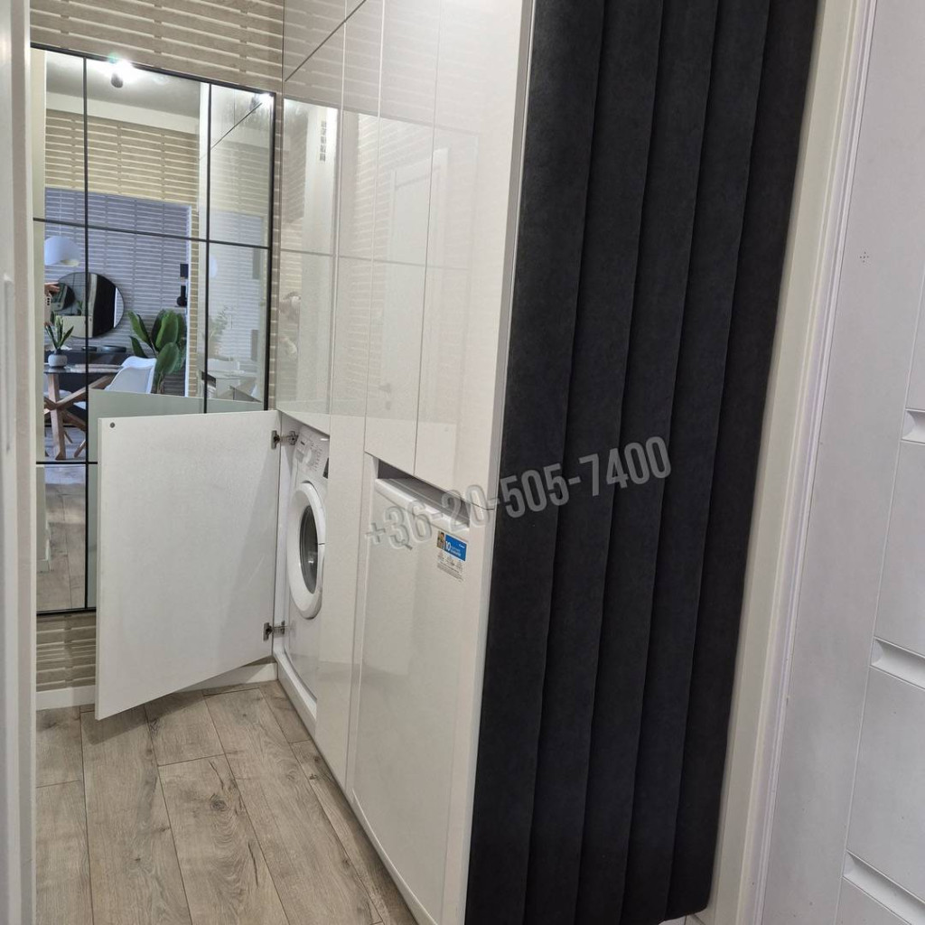 A konyha magas minőségű gépekkel felszerelt, ahol a Gorenje sütő, beépített mikrohullámú sütő, kerámia főzőlap és elegáns üveglapos elszívó mellett a Nespresso kávéfőző és egyéb minőségi konyhai eszközök is a kényelmet szolgálják. A mosógép és a fagyasztós hűtő diszkréten, az előszobai szekrénybe rejtve kapott helyet, így a tér letisztult és egységes marad.