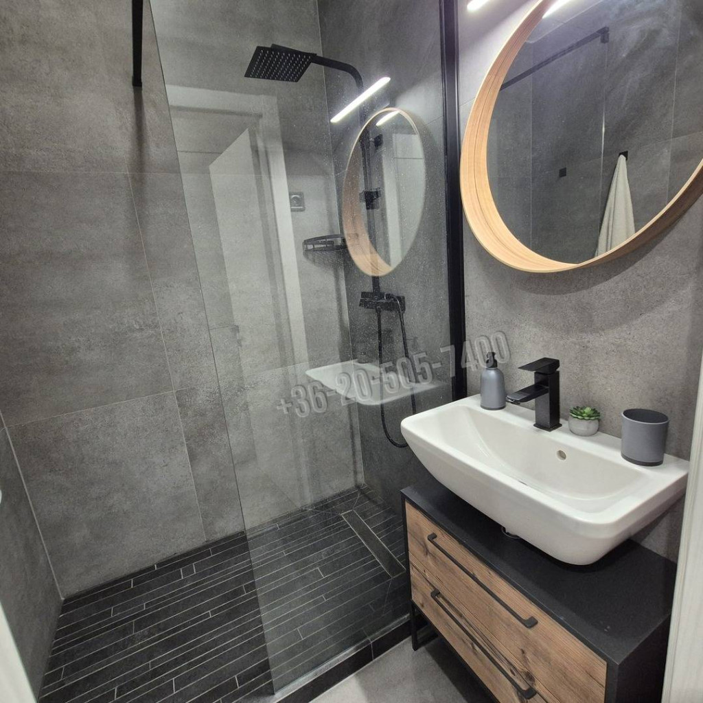 A fürdőszoba átalakítása során a WC áthelyezésével tágasabb tér jött létre, így egy kényelmes, nagyméretű zuhanyzó került kialakításra, modern és elegáns kivitelben.
