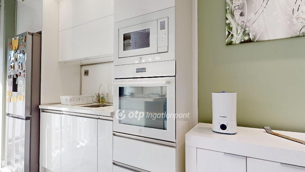 A konyha konyhaszigettel, Electrolux indukciós főzőlappal, beépített sütővel, mikróval, hűtővel és páraelszívóval van felszerelve, valamint AEG mosógép is tartozik hozzá. A teljes bútorzat és háztartási gépek a vételár részét képezik, így az ingatlan azonnal költözhető.