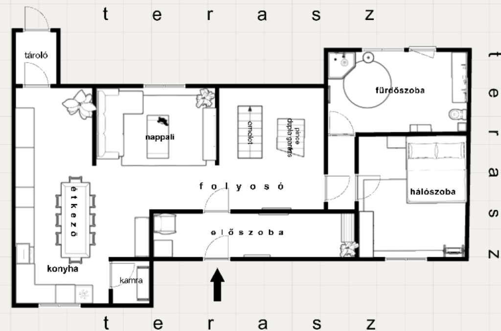 – az alsó szinten helyet kapott 1 hálószoba (17 m²), modern (35 m²) nappali, hatalmas praktikus konyha, étkező (25 m²) spajz (5 m²),