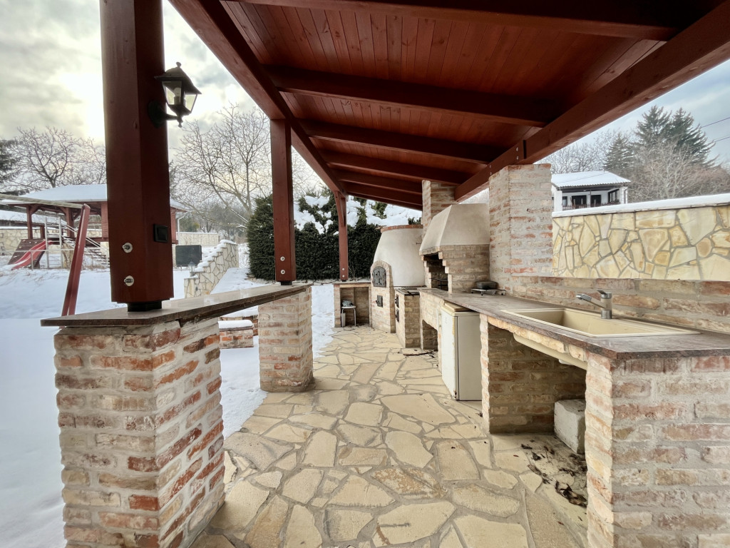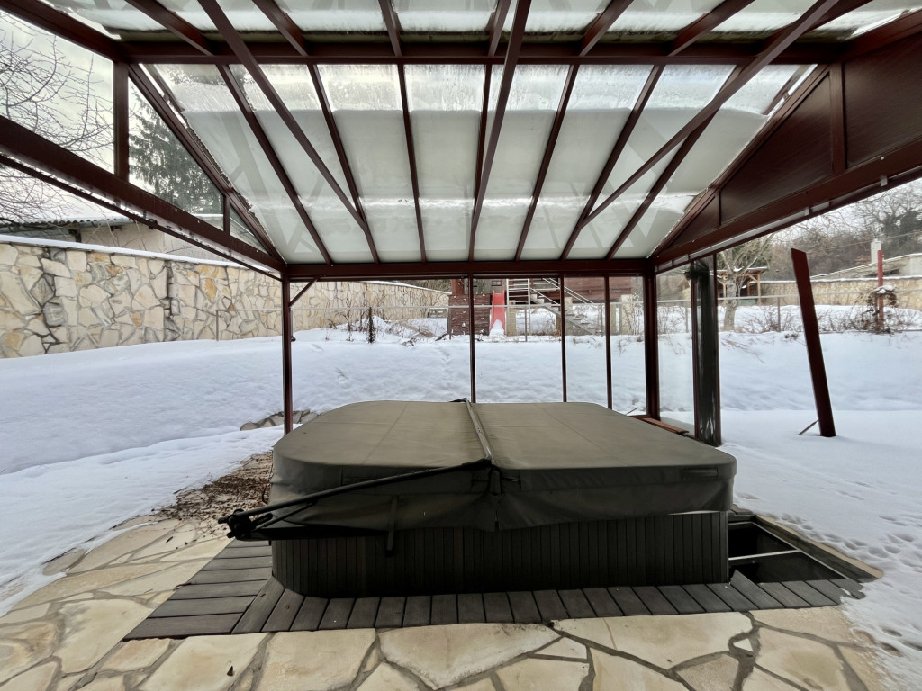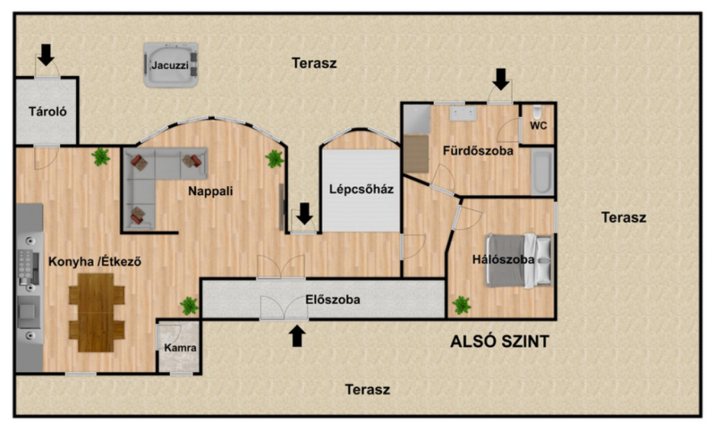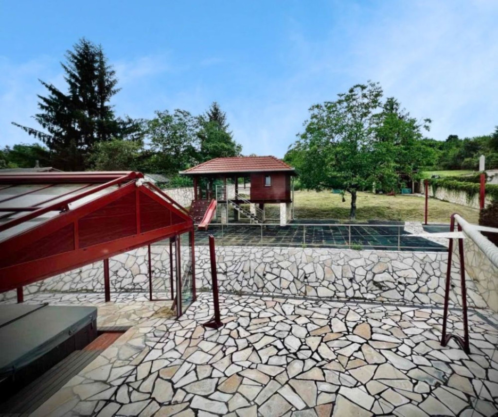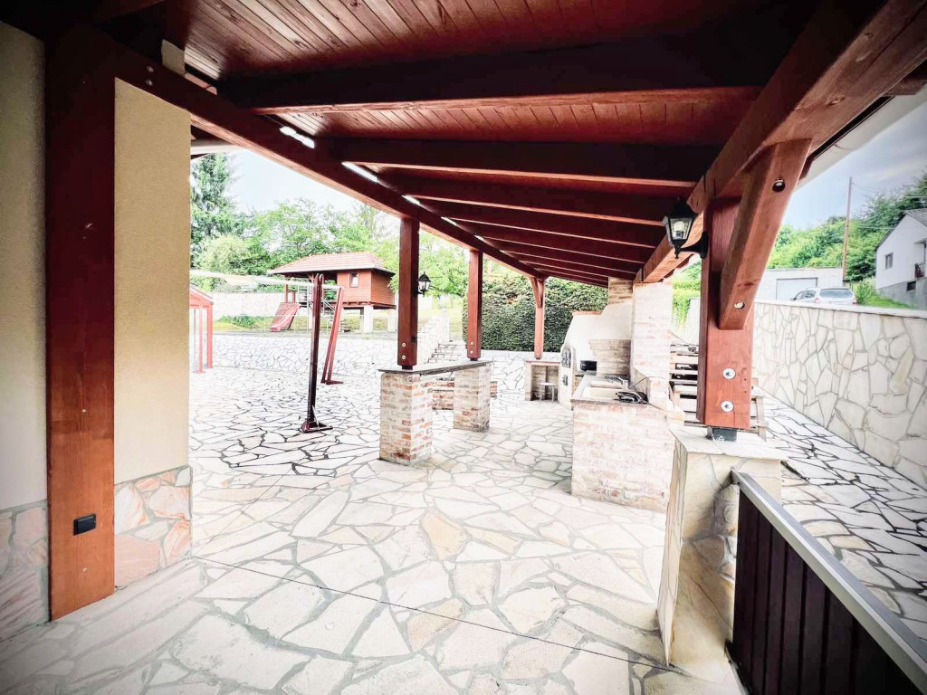 – alul (50 m²) körteraszról lehet élvezni a kert nyújtotta lehetőségeket, (jacuzzi, kerti grillterasz, konyha, szalonnasütő, kemence, játszóházikó 20 m²)