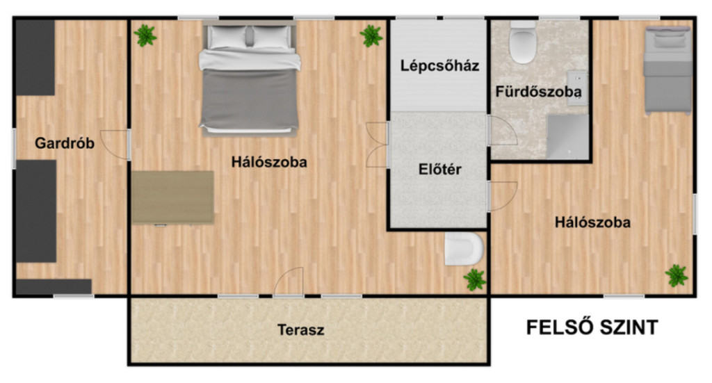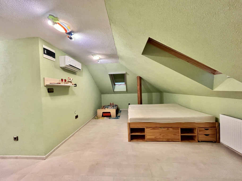 – a felső szinten kialakításra került előtér (10 m²), 2 hálószoba (40 m², 20 m² alapterületű), fürdőszoba (6 m²), felső terasz(15 m²), tároló (10 m²)