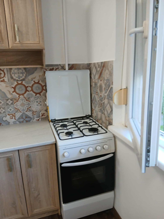 A konyhában alig használt konyhabútor és tűzhely segíti a leendő háziasszony munkáját.