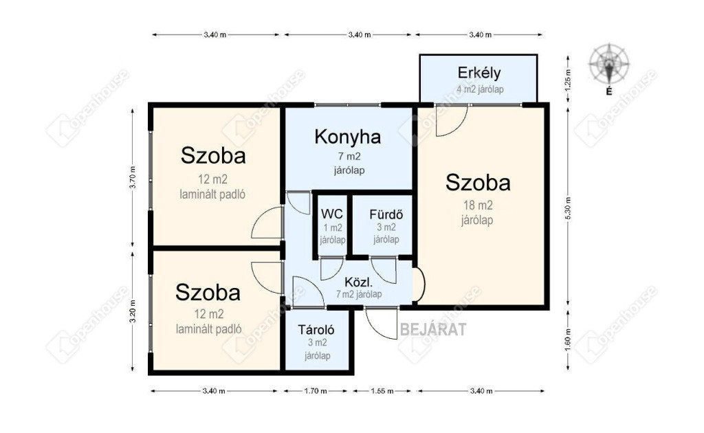 - a szobákban laminált padló, a nappaliban és a többi helyiségben jó állapotú járólap van
