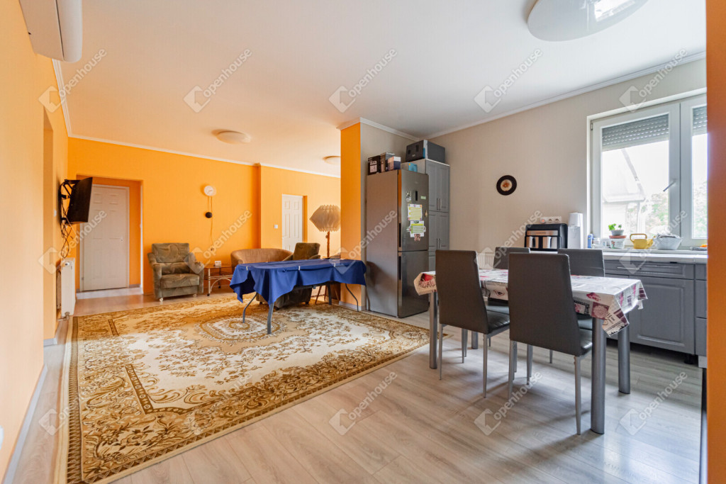 A lakás belső tere minden igényt kielégít: a hatalmas amerikai konyhás nappali a központi élettér, ahol a család és a barátok is kényelmesen összegyűlhetnek. A nappali mellett három külön nyíló hálószoba biztosítja a privát szférát, így ideális megoldás nagyobb családnak, otthoni irodát keresőknek vagy akár vendégszobának is.