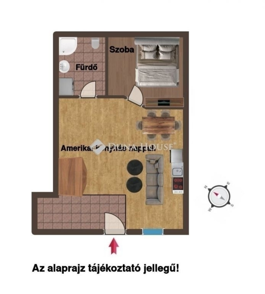 -Amerikai konyhás nappali, hálószoba, fürdő wc-vel