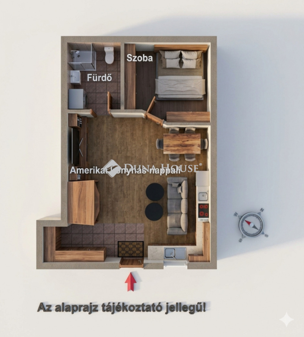 -Amerikai konyhás nappali, hálószoba, fürdő wc-vel