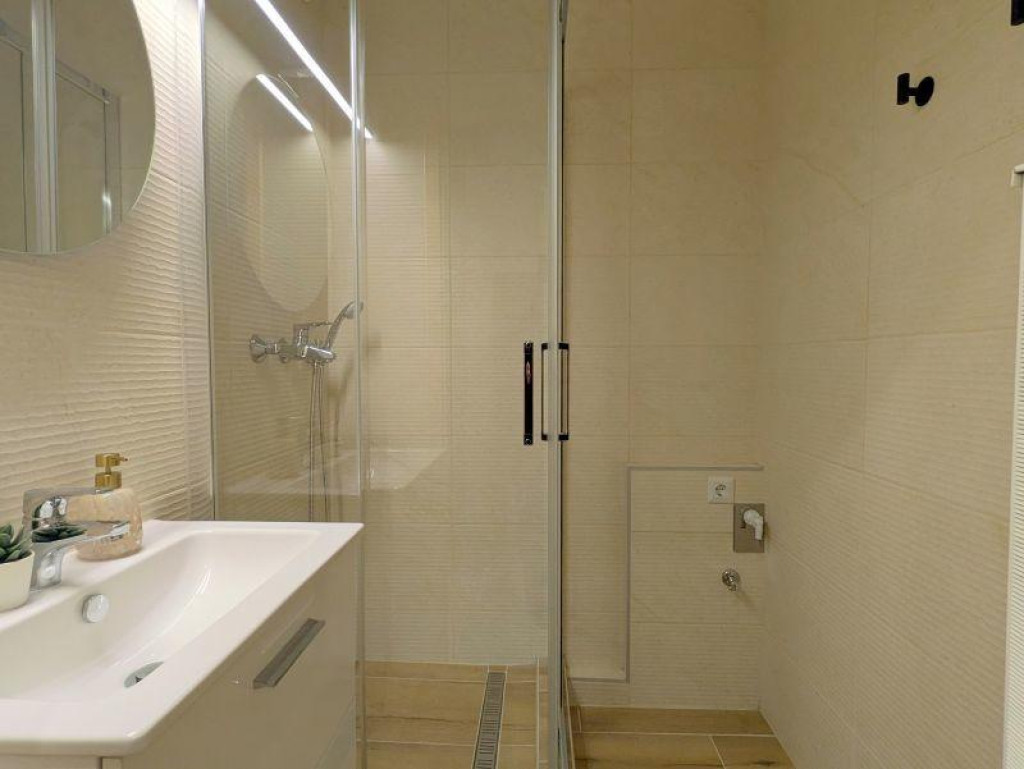 A piszkos munkát már elvégezték: Nem kell falat vésnie! A villanyvezetékeket teljesen felújították, sőt, a hálózat már a klíma beszerelésére is fel van készítve. A fürdőszoba modern arculatot kapott: igényes zuhanyzó és praktikus mosógép-kiállás várja az új lakót.