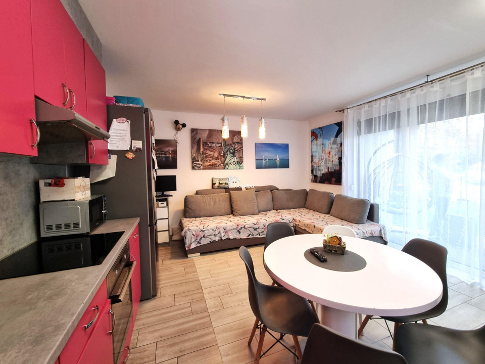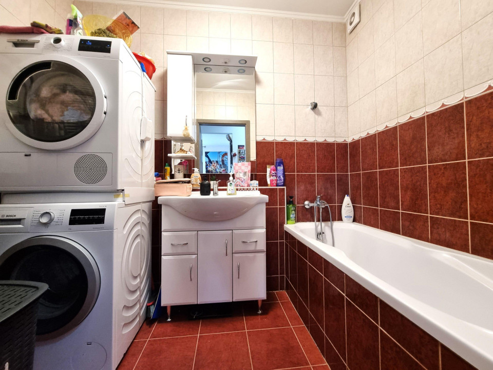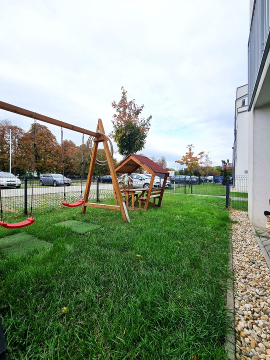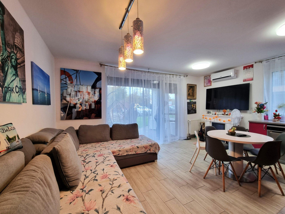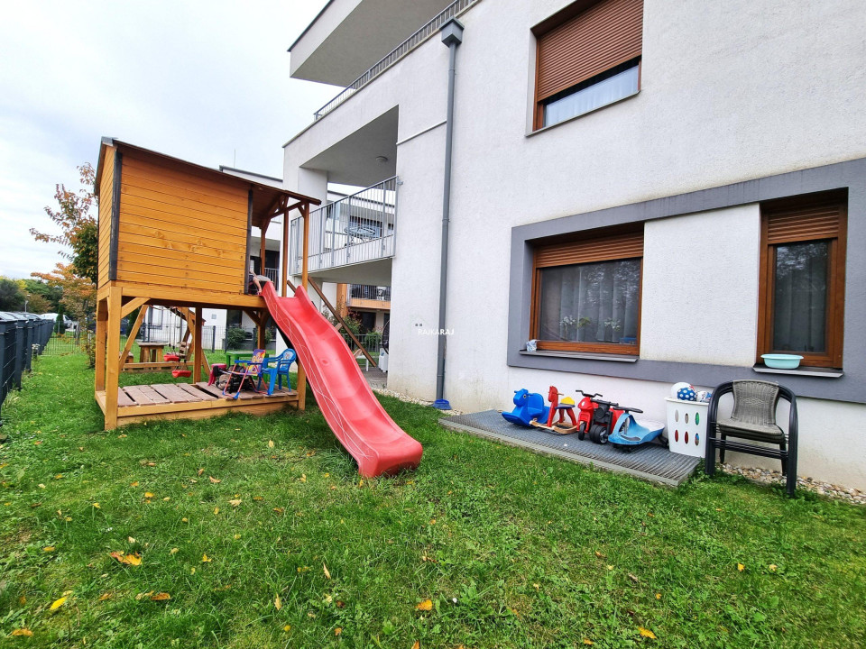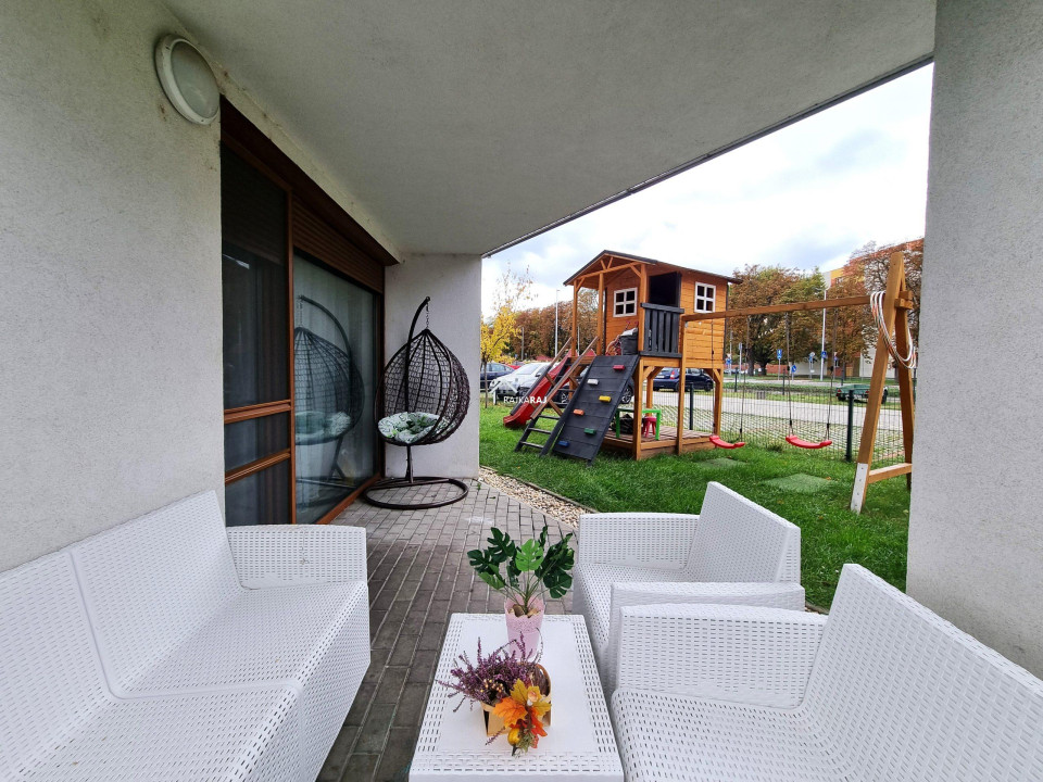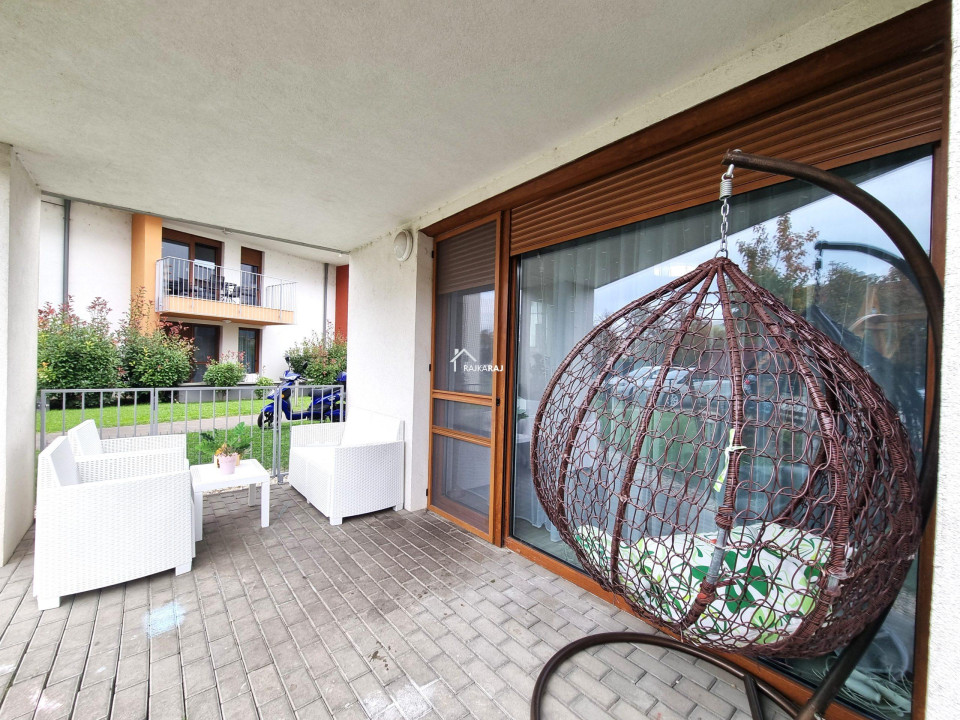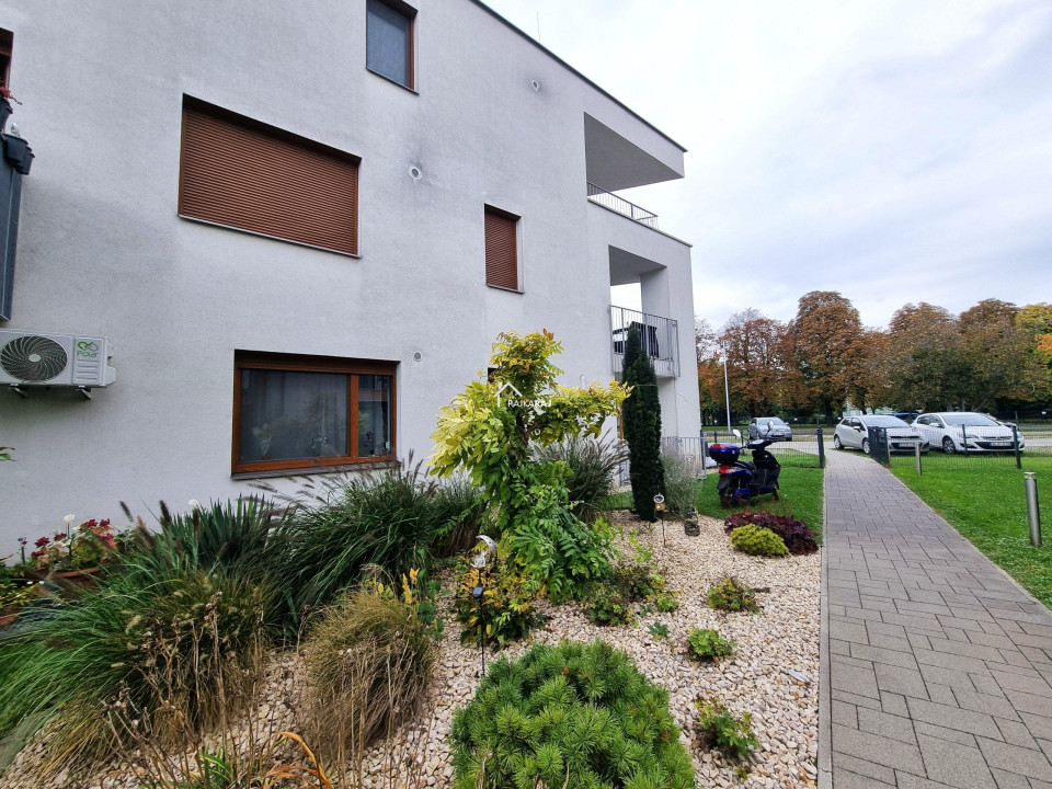 A nappaliból 13 m2-es térkövezett fedett terasz nyílik valamint egy 50 m2 nagyságú kertrész. A társasház zárt udvarában 2 db felszíni parkoló bérelhető a lakáshoz illetve 1 db mélygarázsban lévő kocsibeálló megvásárolható a vételáron felül. Kiváló lehetőség fiatal életkezdő párnak illetve aki kihasználná a város központi elhelyezkedésének előnyeit. Közvetlen közelében buszmegálló, oktatási intézmények, üzletek és orvosi rendelő is megtalálható.