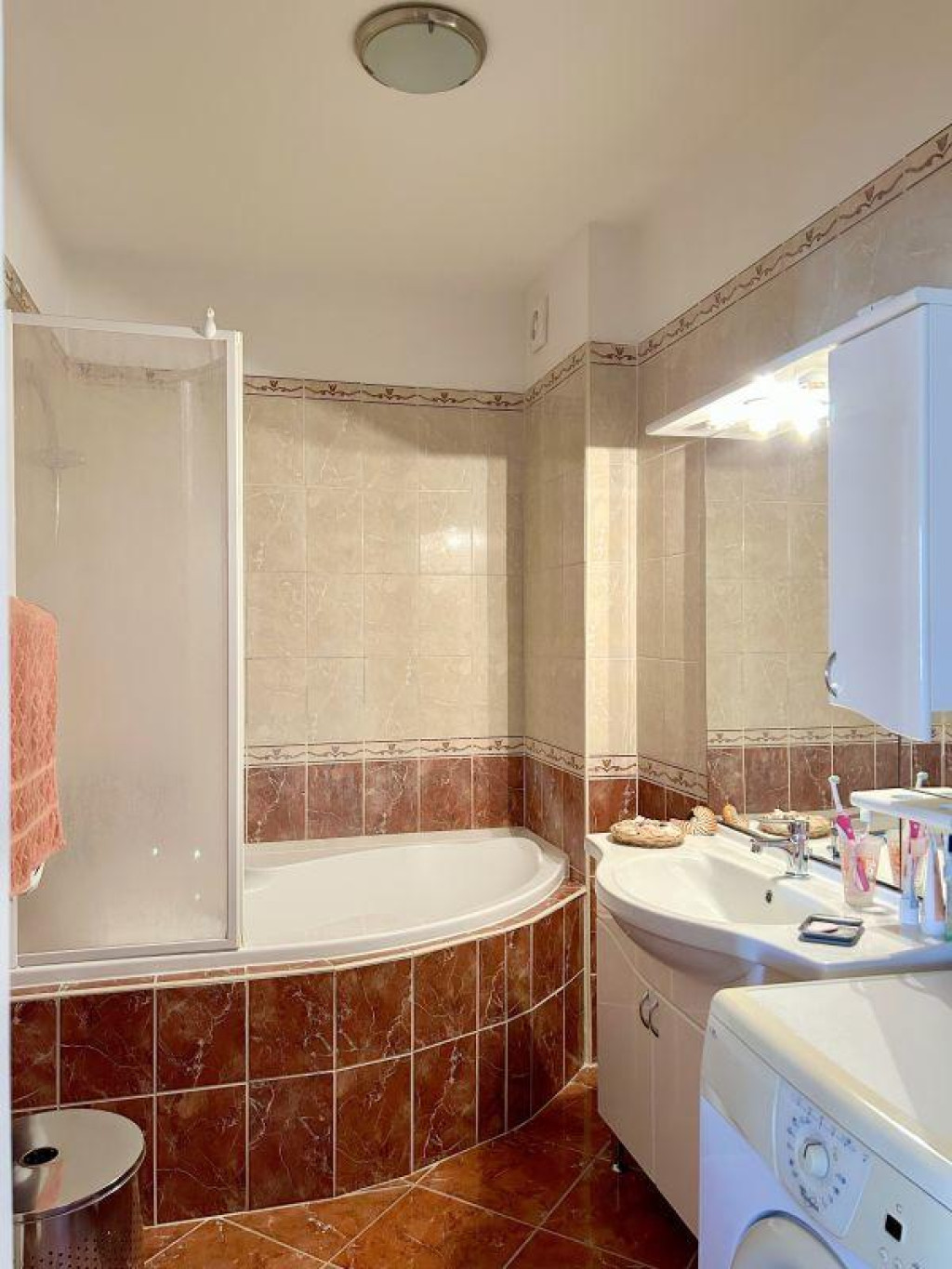 Extrák, amik számítanak: Saját felszíni parkoló (parkolásgátlóval!), fedett erkély és sarokkádas fürdőszoba.
