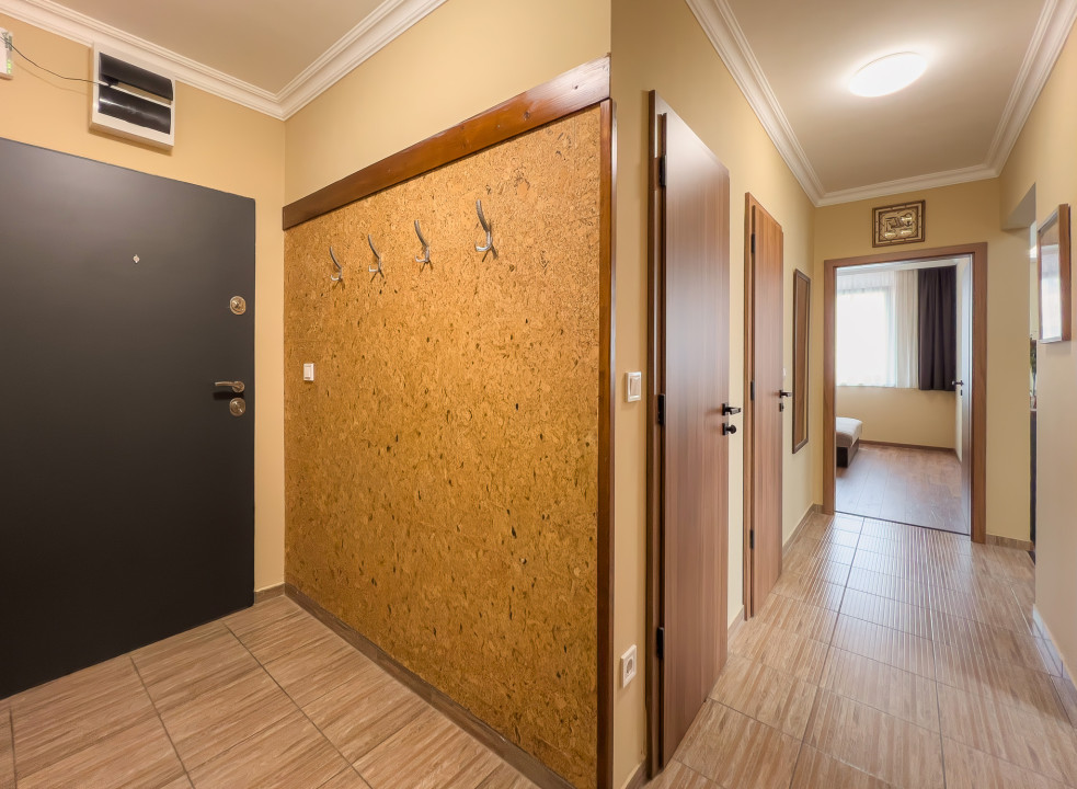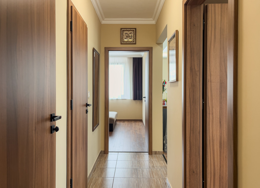 A dél-keleti fekvésű, nagy erkélyes ( 8 nm) lakás helyiségei:előszoba, háztartási helyiség, külön wc, káddal felszerelt fürdőszoba, amerikai konyha, étkező, nappali, egy déli és egy keleti fekvésű hálószoba. A nappaliból juthatunk ki a tágas erkélyre .A konyhabútort, a burkolatokat és a beltéri ajtókat néhány hónapja újitotta fel a tulajdonos.