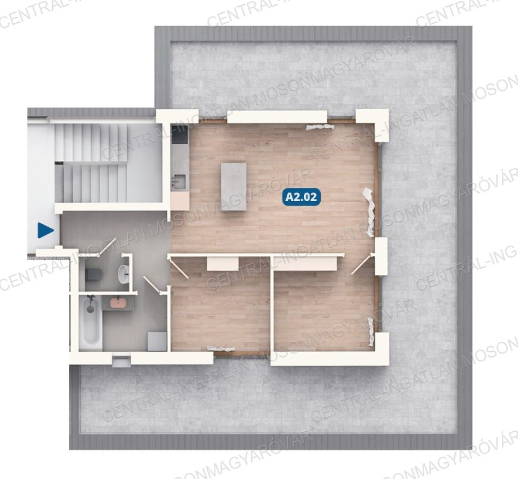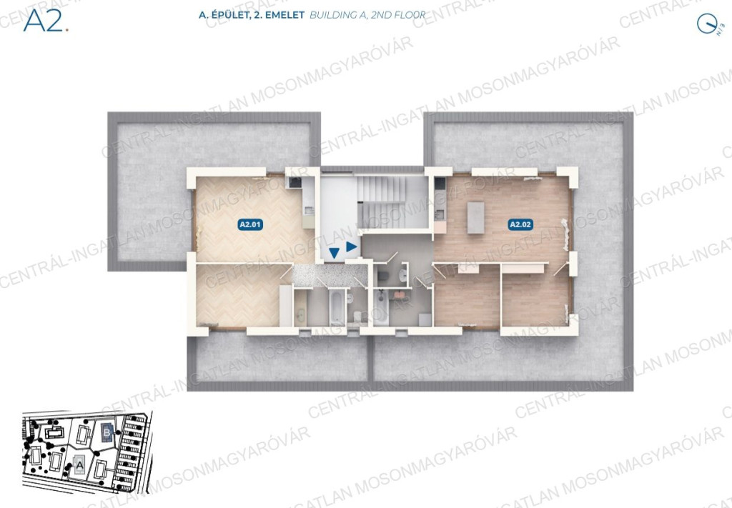 - Az A2.02-es számú második emeleti lakás hasznos alapterület 72.45 m2. A lakás határoló falain belüli terület 59.94 m2, + tetőterasz 62.56 m2 (hasznos alapterület: határoló falakon belüli terület + tetőterasz 20%-a).
