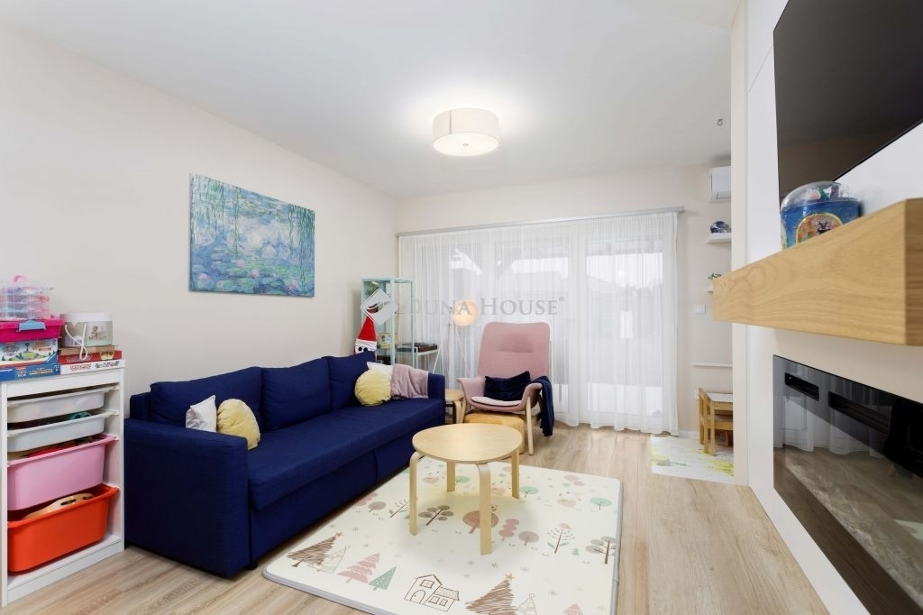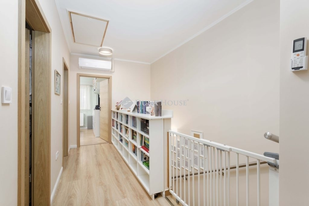 Az emeleti klíma tovább növeli az otthon kényelmét. Az egész lakásra jellemző, a harmónia, a burkolatok és a falak színei, a modern elegancia és kényelem.