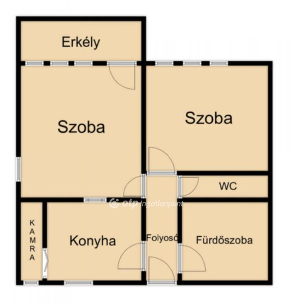A lakás helyiségei: két szoba, a nagyobbik szobához erkély kapcsolódik, konyha, kamra, előszoba, fürdőszoba és WC,