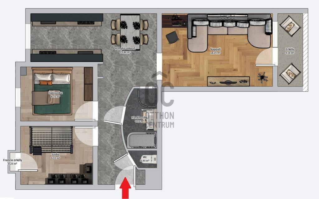 - 2. emeleti, 67 m2-es, 3 szobás.