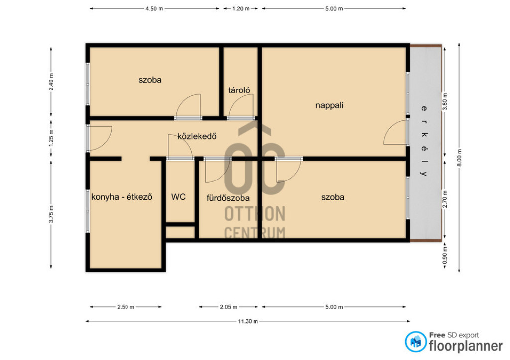 Helyiségek: 3 szoba (ebből egy nappaliként használatos), tágas konyha-étkező, nagy fürdőszoba sarokkáddal, külön WC, erkély és tároló