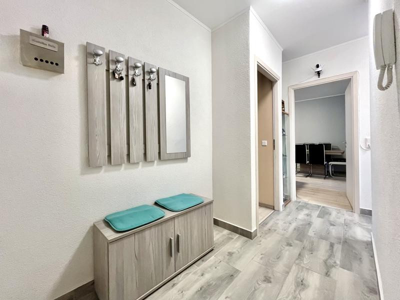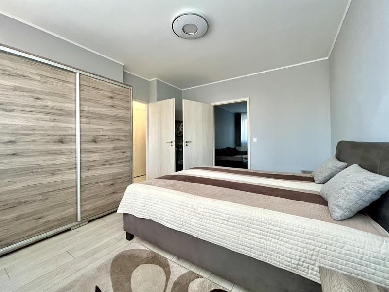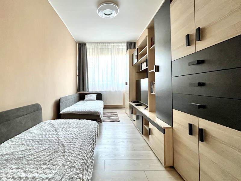 A nappaliból nyílik egy csendes pihenést szolgáló hálószoba, melynek ajtó kiosztása lehetővé teszi nem csak a nappali felé, hanem a közvetlen közlekedőbe való csatlakozást is, így a lakás mindhárom szobája önálló bejáratokon át elérhető. A hálószoba mellett, szintén nyugati tájolású ablakokkal került kialakításra a konyha, melyben új konyhabútor és minőségi beépített gépek találhatók. A lakás középső traktusában egy felújított zuhanyzós fürdőszoba és egy önálló wc helyiség teszi teljessé a komfortot.