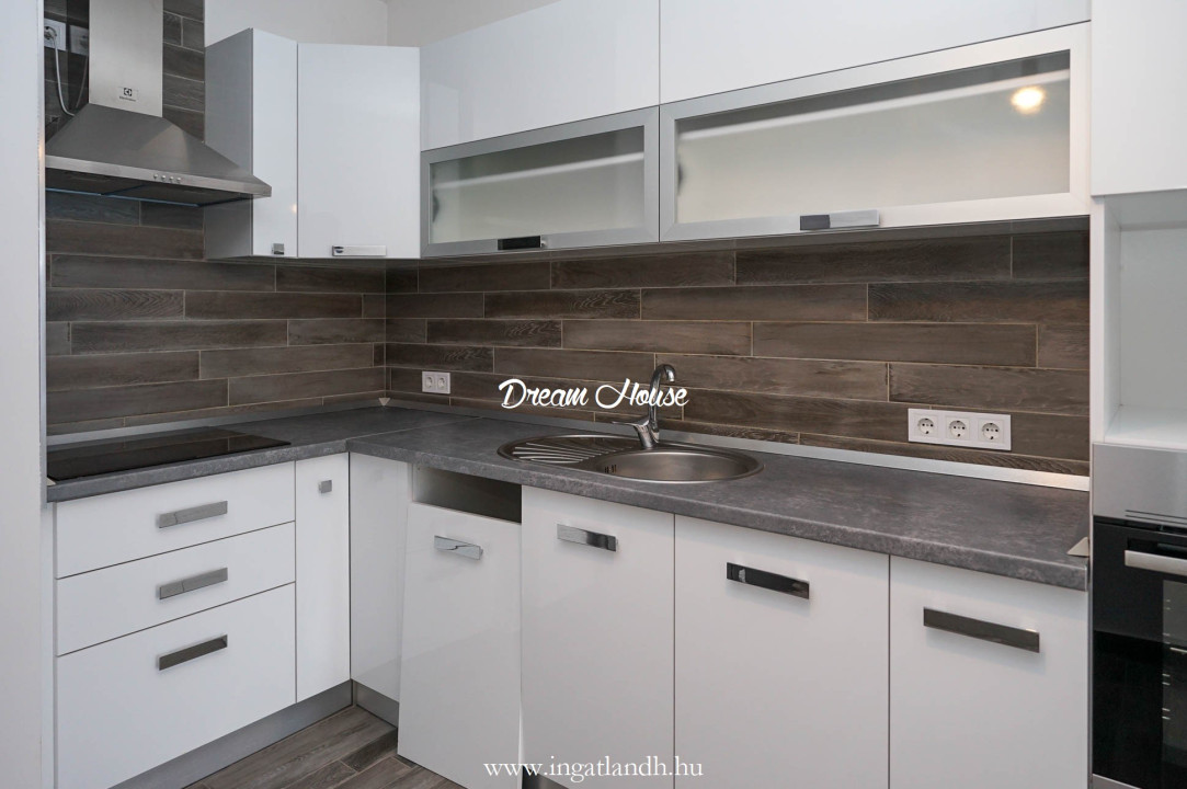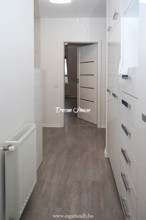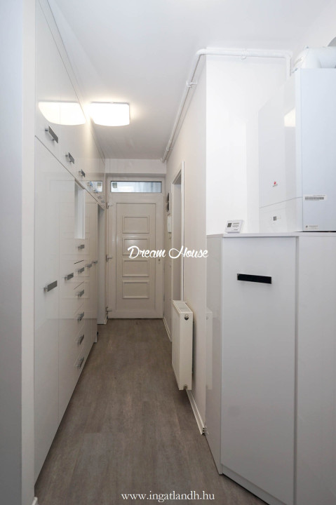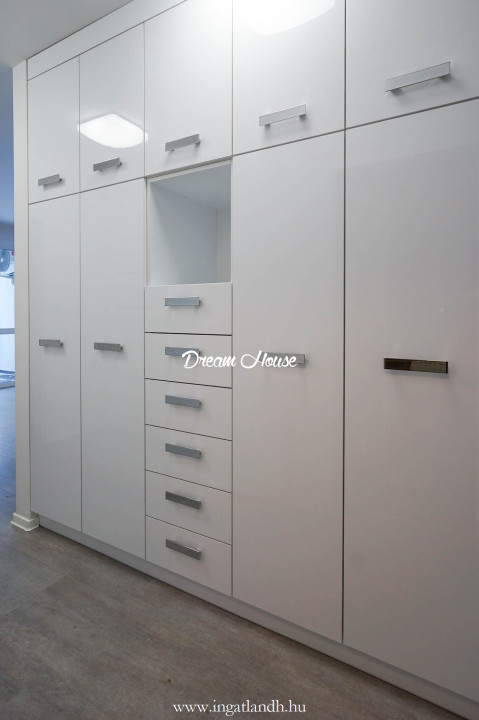 A nappaliban egyedileg, méretre gyártott prémium minőségű konyhabútor került beépítésre, ELECTROLUX beépített konyhai gépekkel felszerelve. Az előszobában modern, magasfényű fehér beépített szekrény biztosítja a kényelmes tárolást.