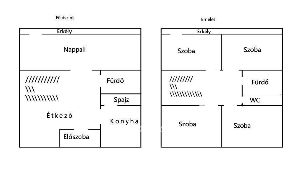 Felső szint: 2 szoba + 2 félszoba + fürdőszoba.