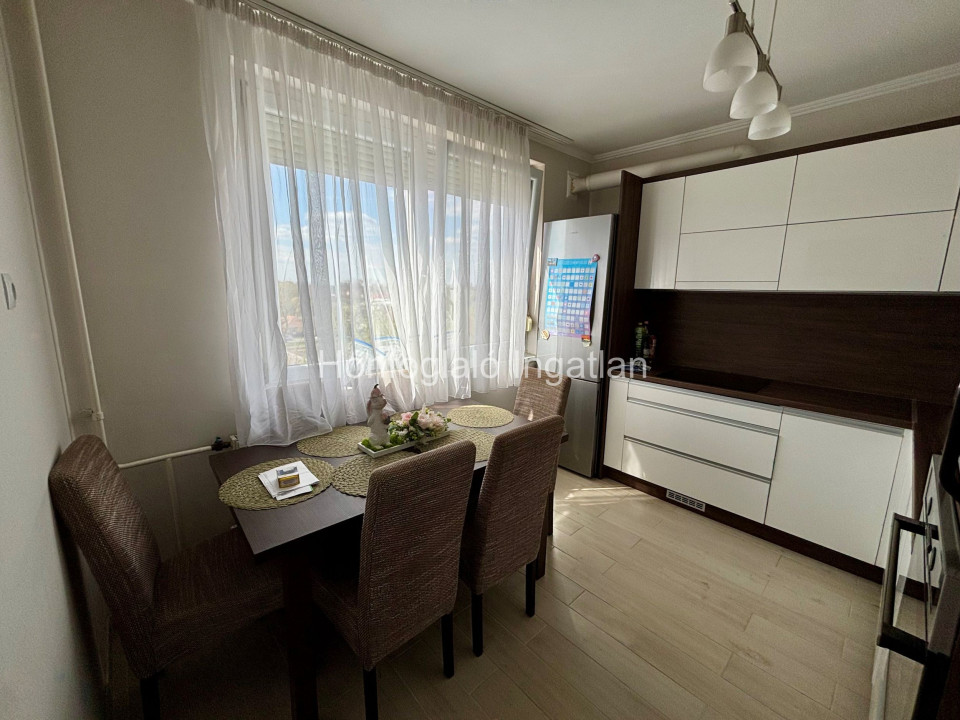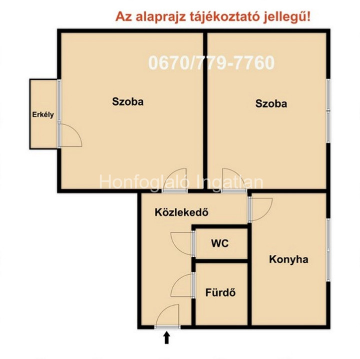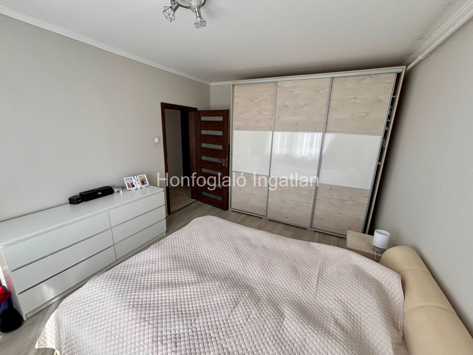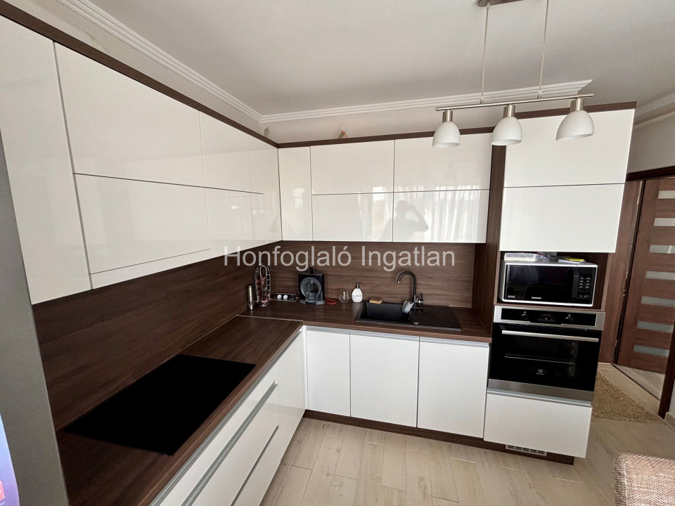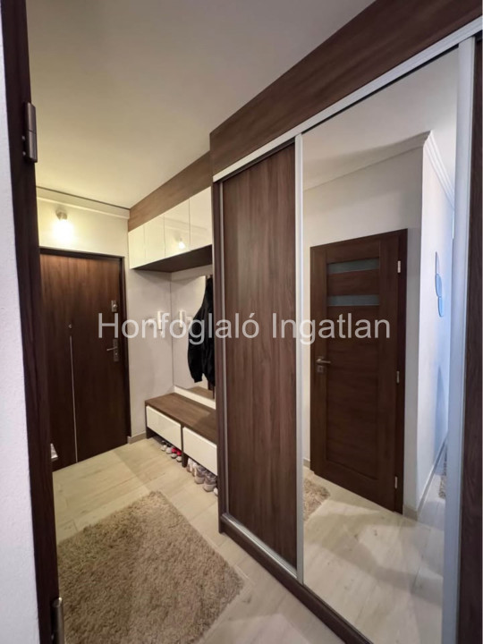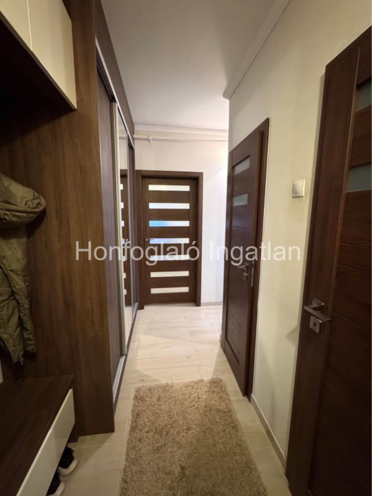 Az ingatlan elrendezése rendkívül praktikus: két külön nyíló szoba, tágas konyha, fürdőszoba, külön WC, valamint egy közlekedő amely modern bútorokkal beépített.